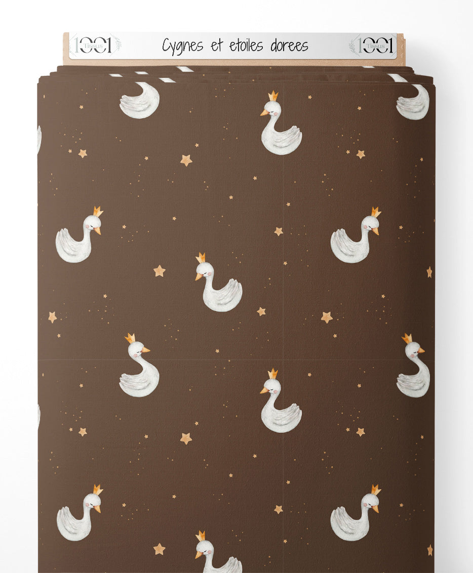 Les cygnes portent de petites couronnes dorées. Les étoiles sont de différentes tailles, ajoutant une touche magique au motif.Les tissus
