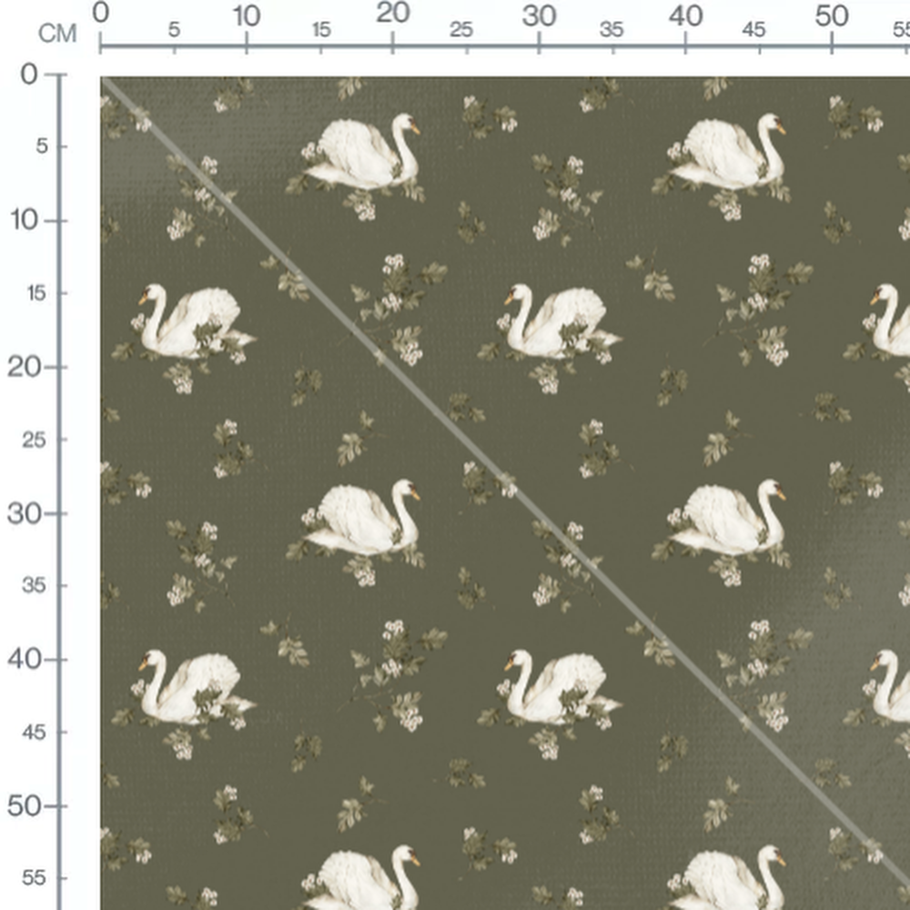 Les cygnes sont élégamment posés parmi des branches feuillues. Les fleurs blanches ajoutent une touche délicate au motif. Le fond vert olive crée une ambiance naturelle et apaisante.Les tissus