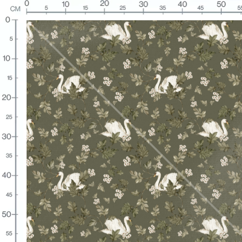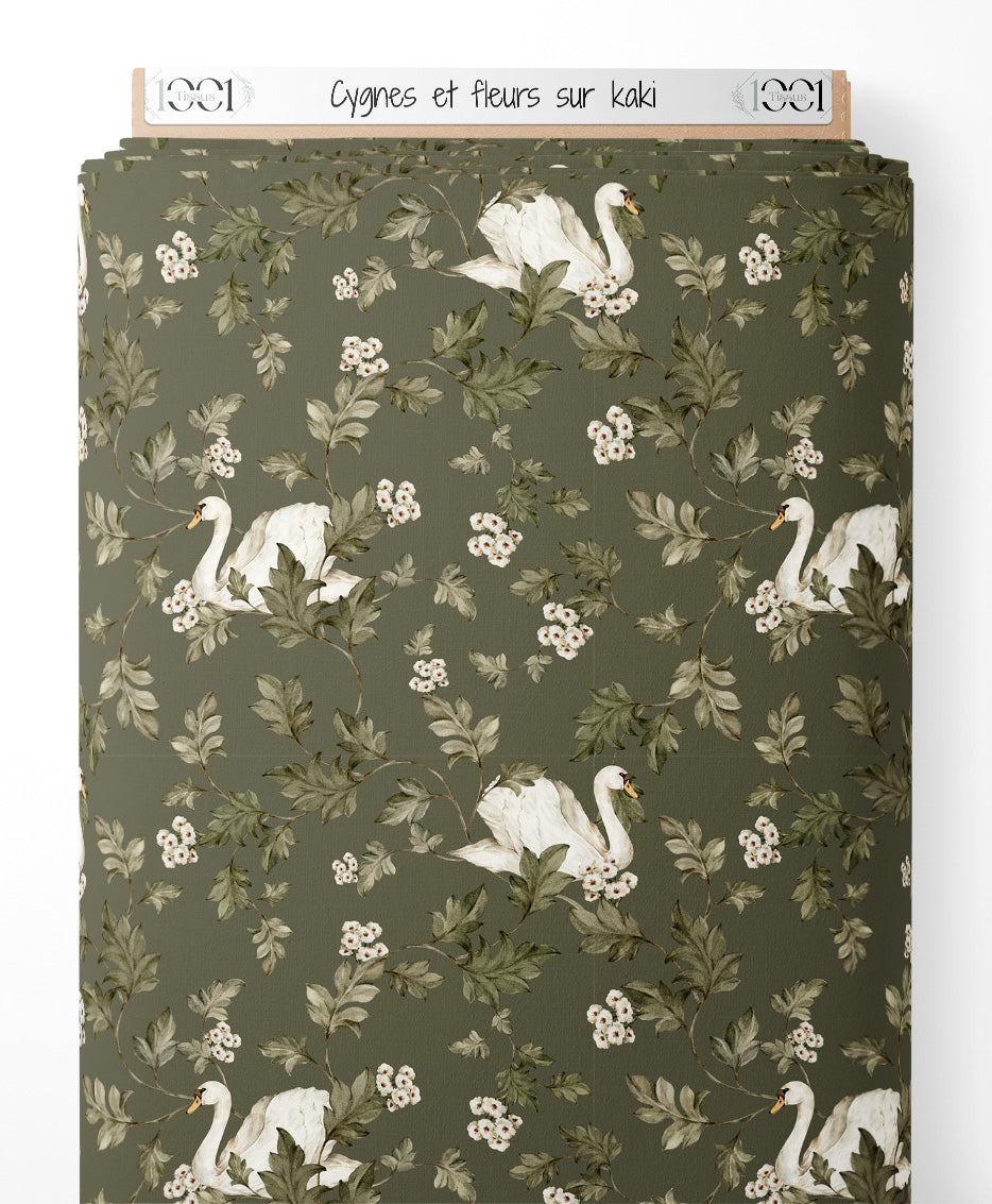 Les cygnes sont élégamment posés parmi les feuillages. Les feuilles sont d'un vert doux, ajoutant une touche naturelle. Les petites fleurs blanches apportent un contraste délicat au motif.Les tissus