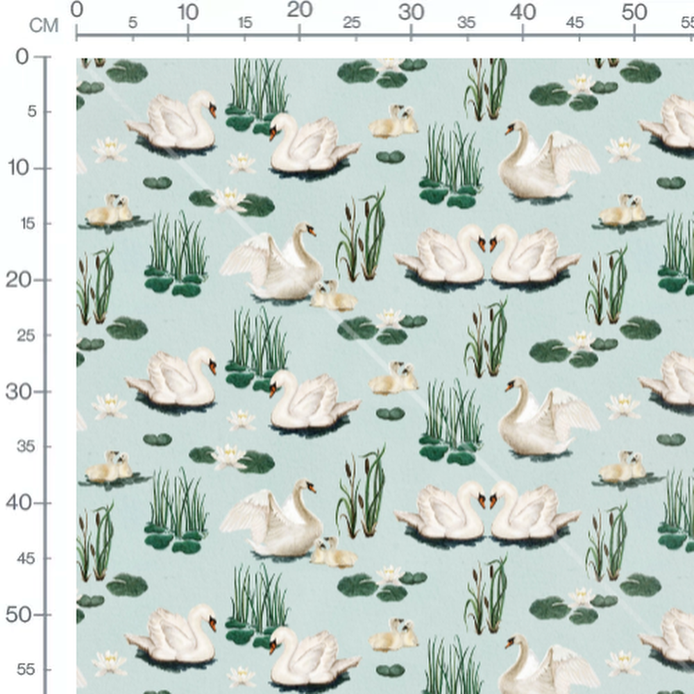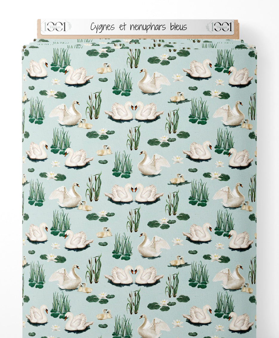 Les cygnes sont accompagnés de petits cygneaux crème. Les nénuphars flottent autour des cygnes. Des herbes aquatiques ajoutent une touche de verdure. Les fleurs blanches contrastent avec le fond bleu clair.Les tissus