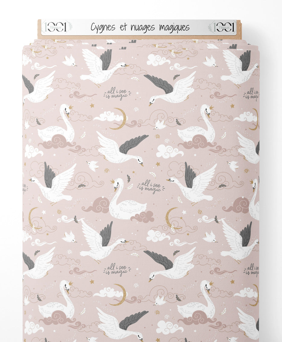 Petits oiseaux blancs ajoutent une touche délicate. Étoiles dorées et inscriptions apportent une ambiance enchantée.Les tissus