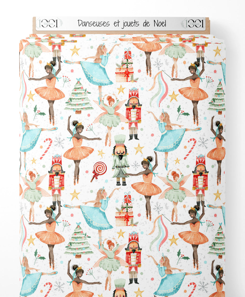 Les danseuses portent des robes bleues et orange avec des détails délicats. Les jouets incluent des soldats et des cadeaux colorés. Des éléments festifs comme des étoiles dorées et des sapins verts complètent le motif. Des cannes en sucre et des flocons de neige ajoutent une touche de fête.Les tissus