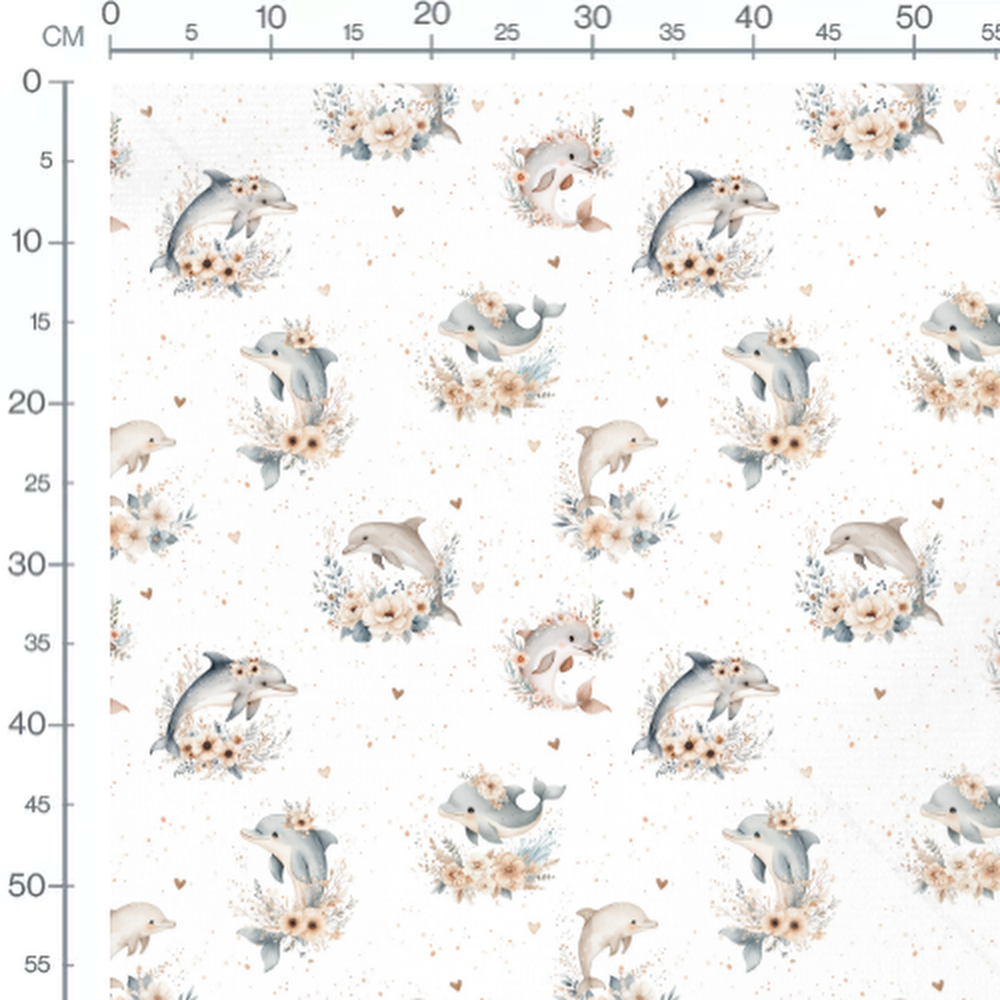 Les dauphins sont ornés de couronnes de fleurs délicates. Des motifs floraux beige et bleu entourent les dauphins, ajoutant une touche douce et rêveuse.Les tissus