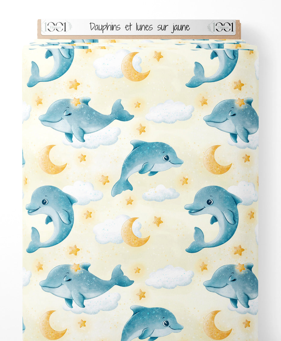 Tissu - Dauphins et lunes sur jaune