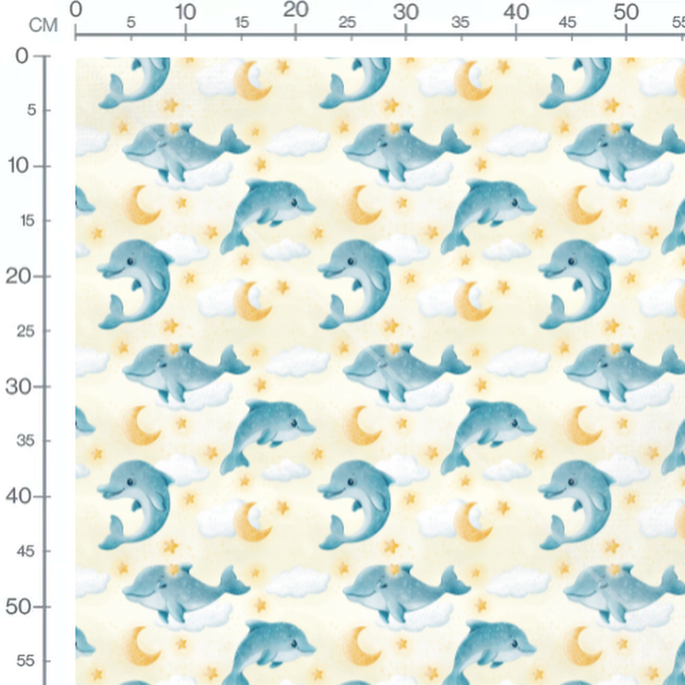 Les dauphins sont entourés de nuages doux et de petites étoiles dorées. Les lunes dorées ajoutent une touche de rêve au motif. Le fond jaune pâle crée une ambiance apaisante.Les tissus