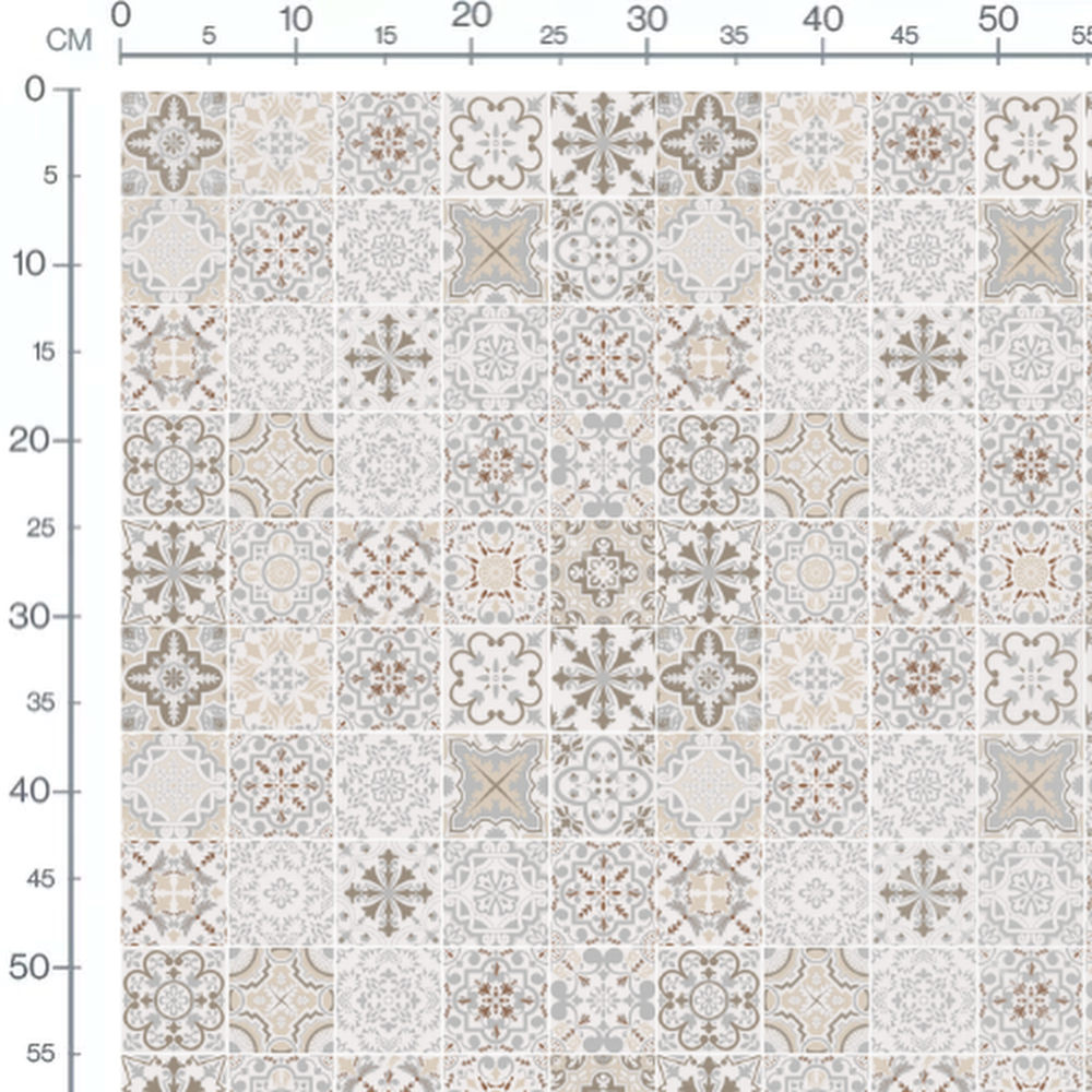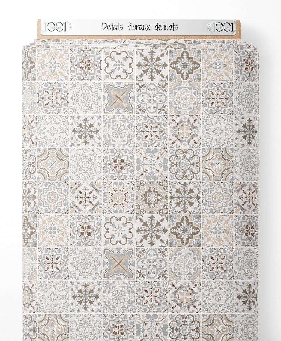 Les motifs incluent des formes florales et des arabesques complexes. Les couleurs varient entre le beige, le gris et le blanc. Chaque carreau présente un design unique avec des éléments symétriques. Les détails sont fins et délicats, créant un effet visuel harmonieux.Les tissus