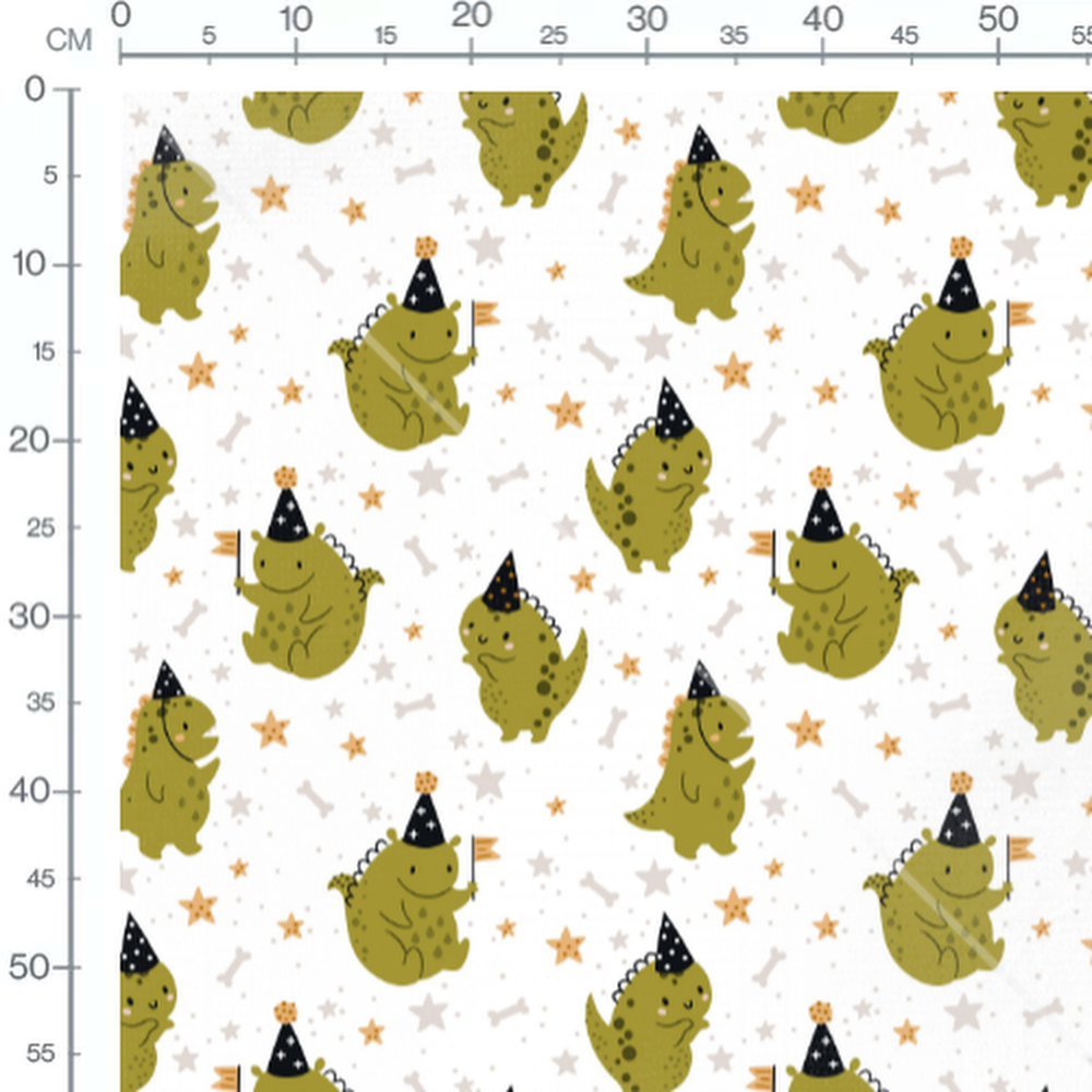 Les dinosaures portent des chapeaux noirs à pois blancs. Des étoiles orange et des os gris ajoutent des détails ludiques au motif.Les tissus