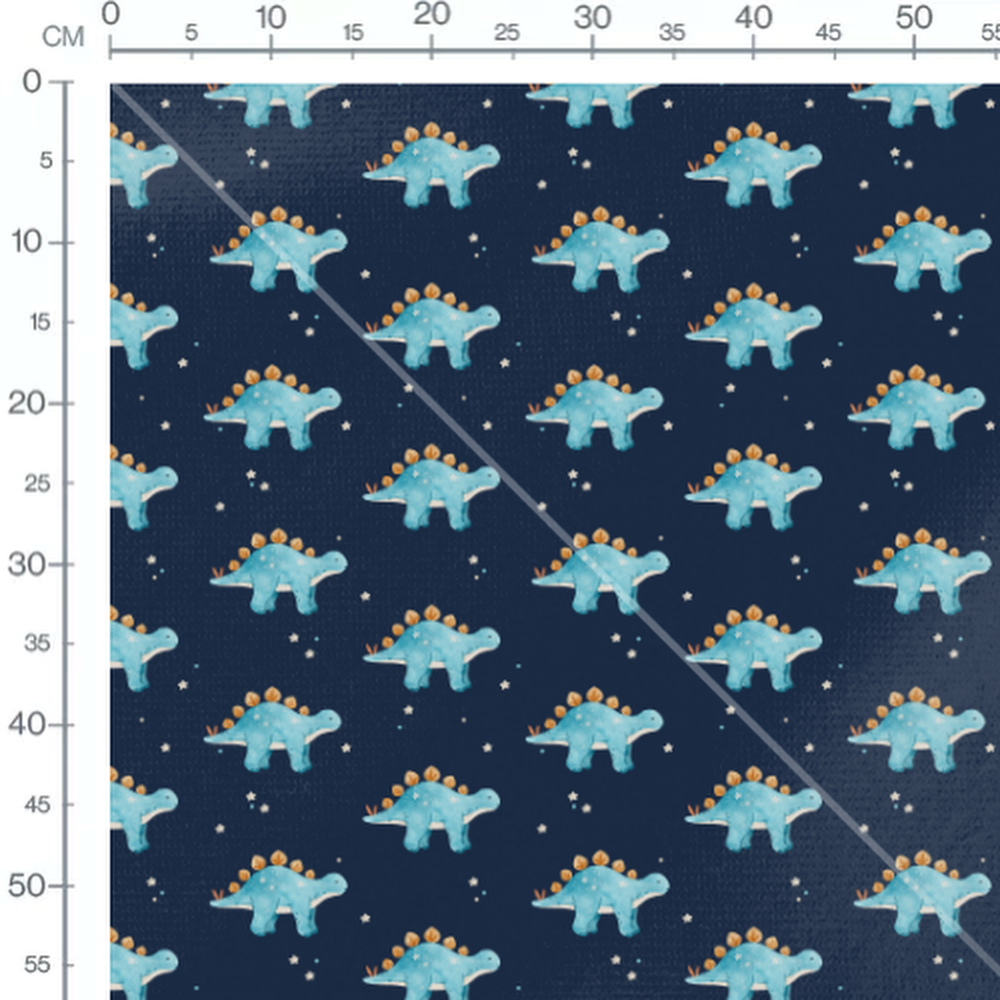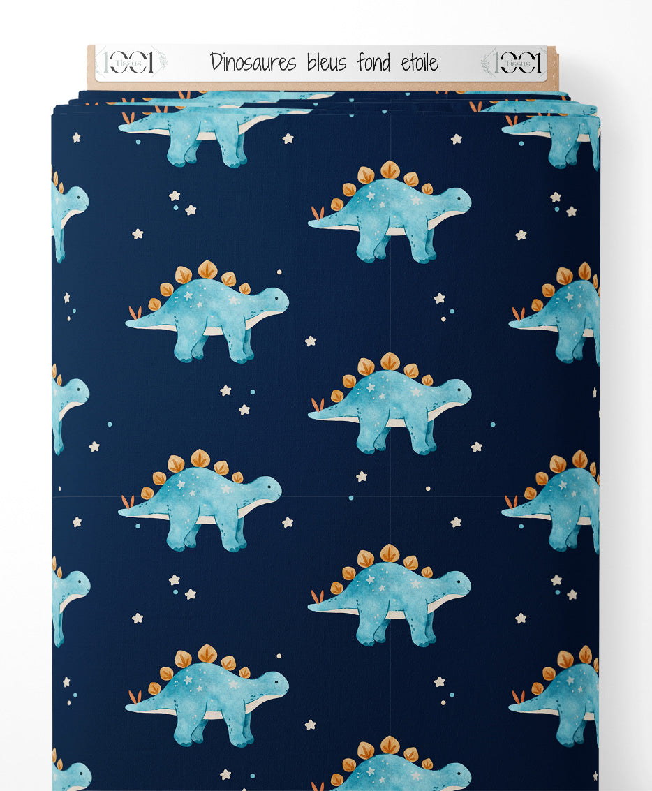 Les dinosaures ont des détails blancs et des plaques orange sur le dos. Le fond bleu nuit est parsemé de petites étoiles blanches et quelques points bleus clairs.Les tissus
