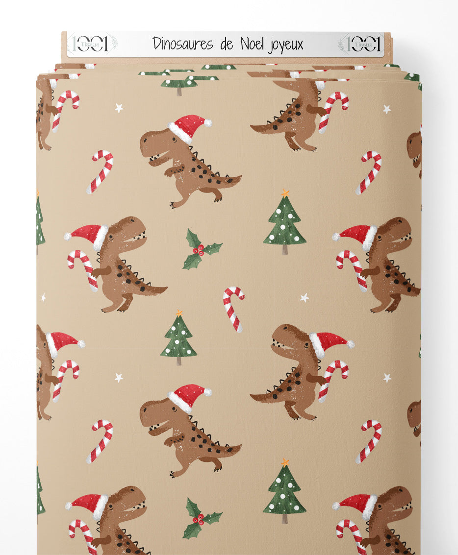 Les dinosaures portent des bonnets de Noël rouges et blancs. Des cannes à sucre rouges et blanches et des sapins verts décorent le fond. Des feuilles de houx vertes avec des baies rouges ajoutent une touche festive.Les tissus