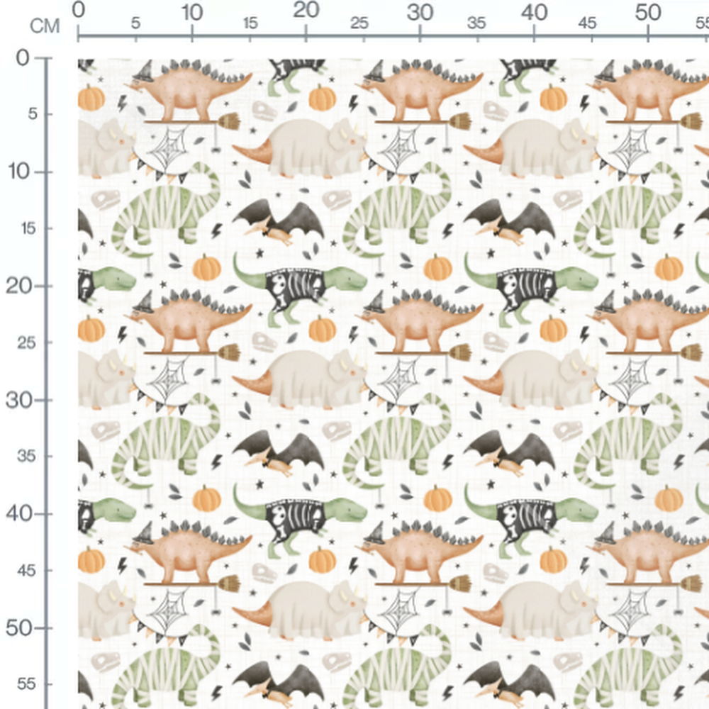Les dinosaures portent des chapeaux de sorcière et des capes. Des citrouilles orange et des toiles d'araignée noires complètent le motif. Des éléments comme des éclairs et des ossements ajoutent une touche effrayante.Les tissus