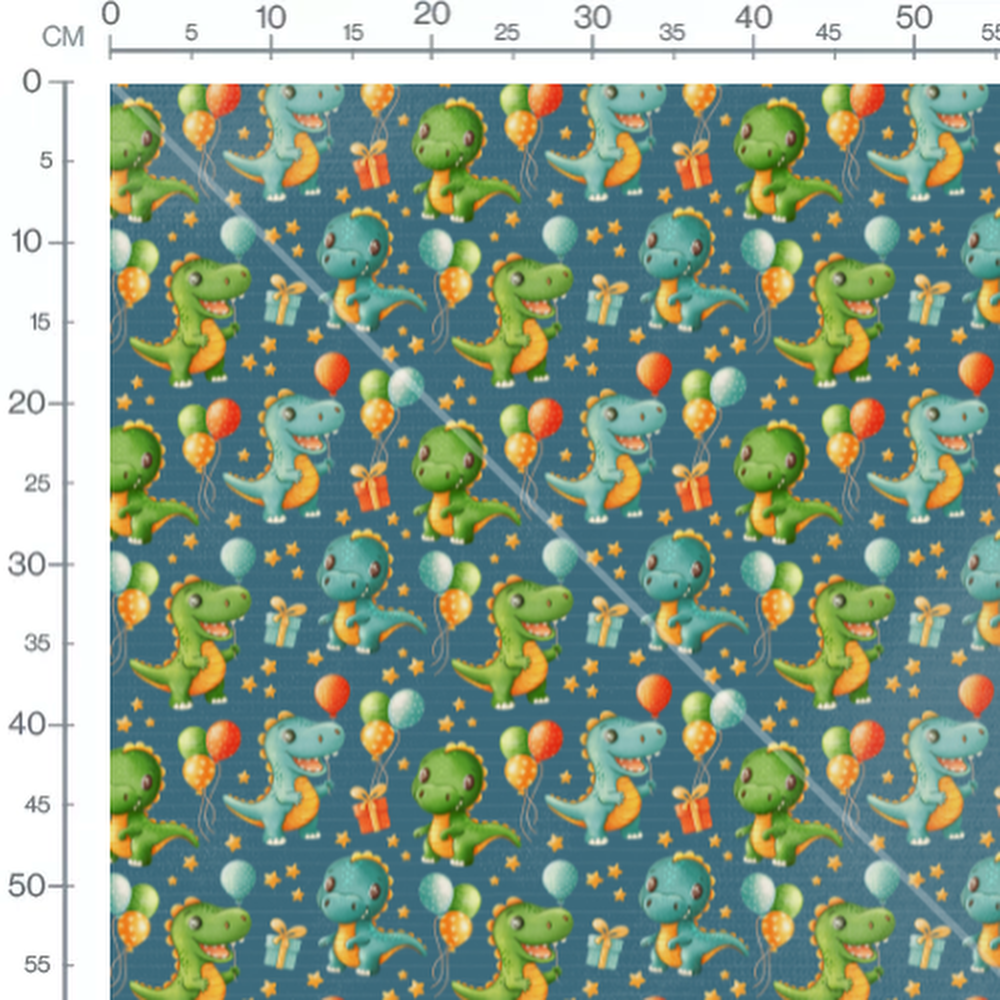 Les dinosaures tiennent des ballons de différentes couleurs. Des cadeaux avec des rubans sont dispersés parmi les étoiles jaunes.Les tissus