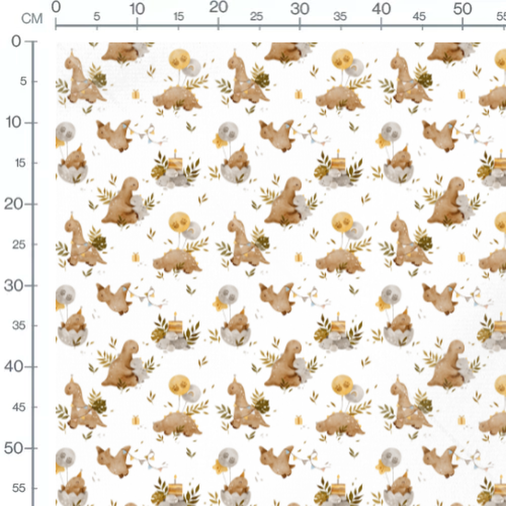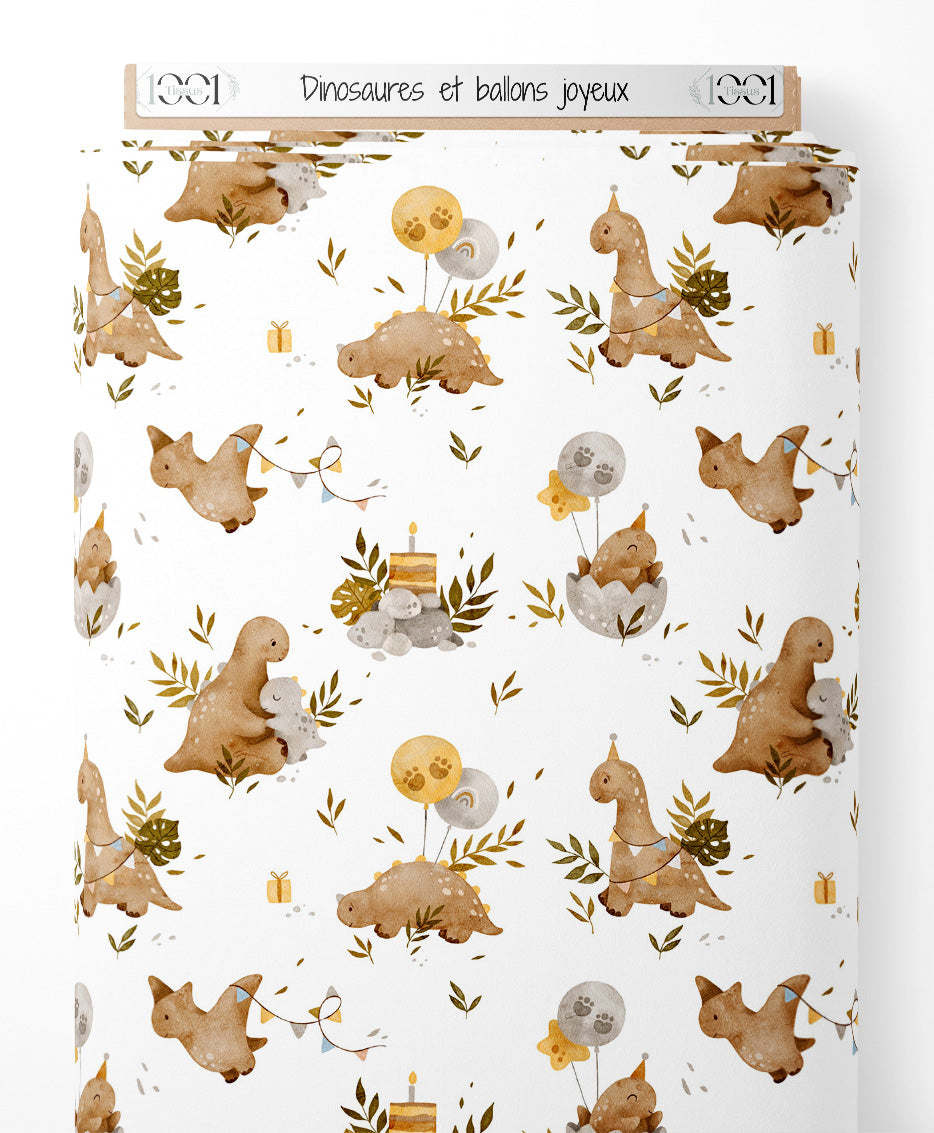 Les dinosaures portent des chapeaux de fête et tiennent des ballons. Des éléments festifs comme des gâteaux et des guirlandes sont présents. Quelques étoiles jaunes et empreintes de pattes décorent le motif.Les tissus