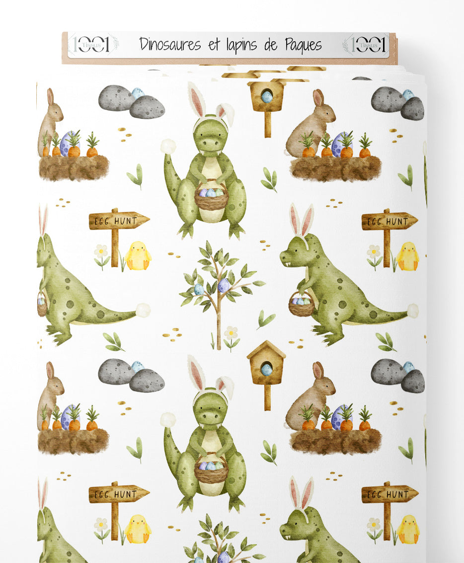 Un dinosaure vert porte un panier rempli d'œufs colorés. Un lapin brun est assis à côté de carottes et d'œufs. Un panneau indique 'Egg Hunt' à côté d'un poussin jaune. Des arbres et des nichoirs complètent le motif festif.Les tissus