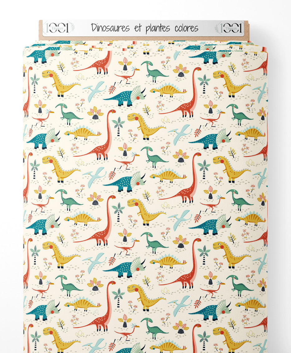 Les dinosaures sont accompagnés de petites plantes et de fleurs stylisées. Les couleurs vives des dinosaures contrastent avec le fond crème. Les motifs incluent des dinosaures de différentes formes et tailles.Les tissus
