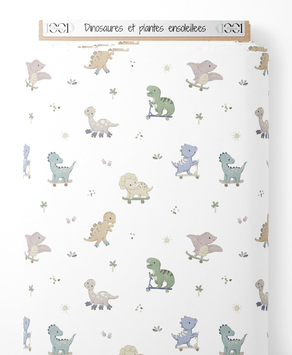 Les dinosaures sont de différentes couleurs pastel comme le bleu, le vert et le beige. Ils sont accompagnés de petits motifs de plantes et de soleils. Chaque dinosaure est sur une planche à roulettes ou une trottinette.Les tissus