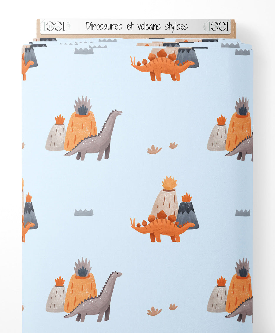 Les dinosaures sont accompagnés de volcans stylisés. Les couleurs dominantes incluent l'orange, le gris et le bleu clair.Les tissus