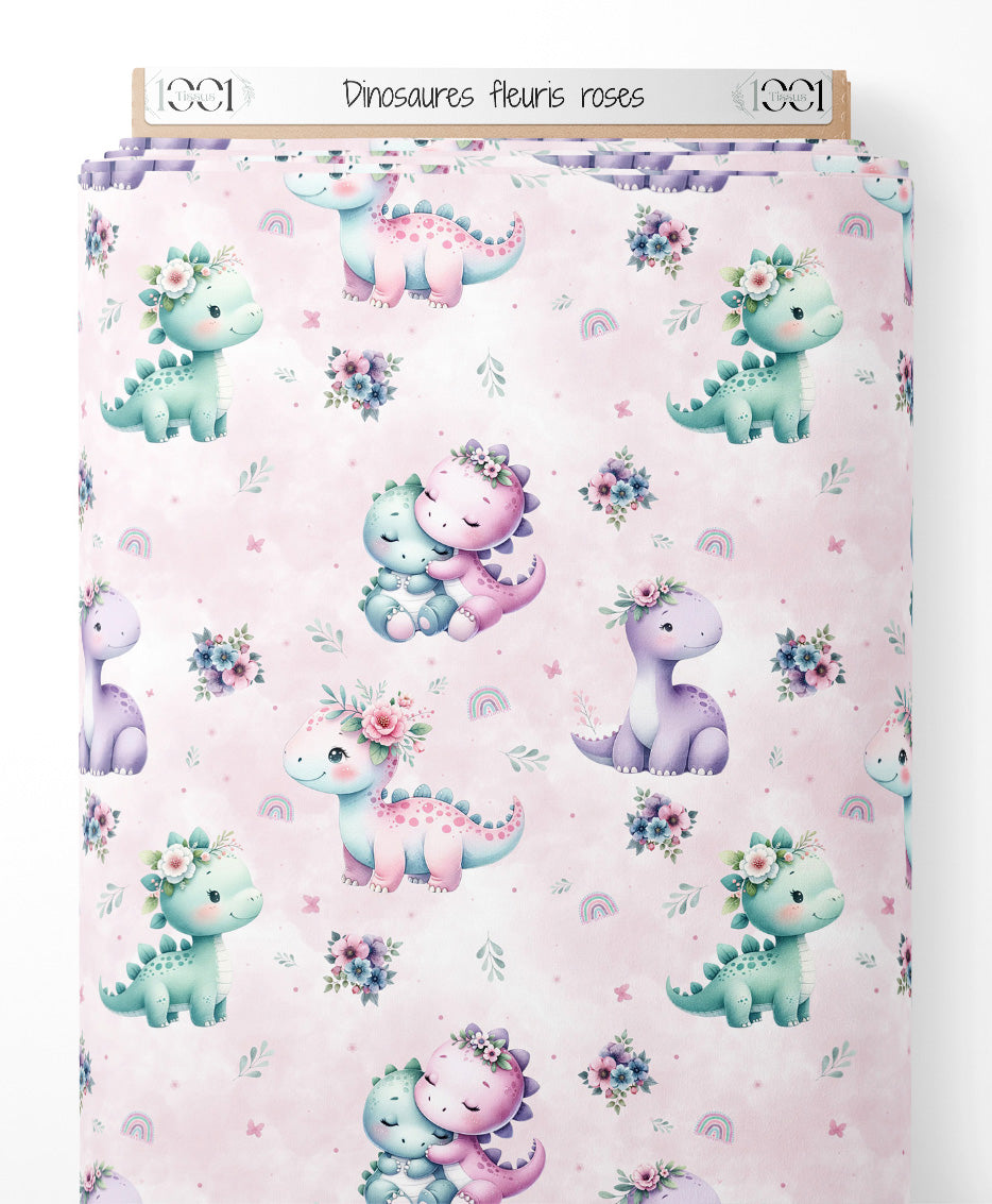 Les dinosaures sont ornés de couronnes de fleurs et affichent des teintes pastel. De petits arcs-en-ciel et des bouquets de fleurs ajoutent une touche de douceur. Des feuilles vertes parsèment le fond rose clair.Les tissus
