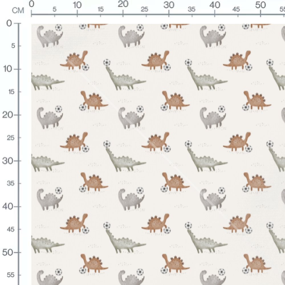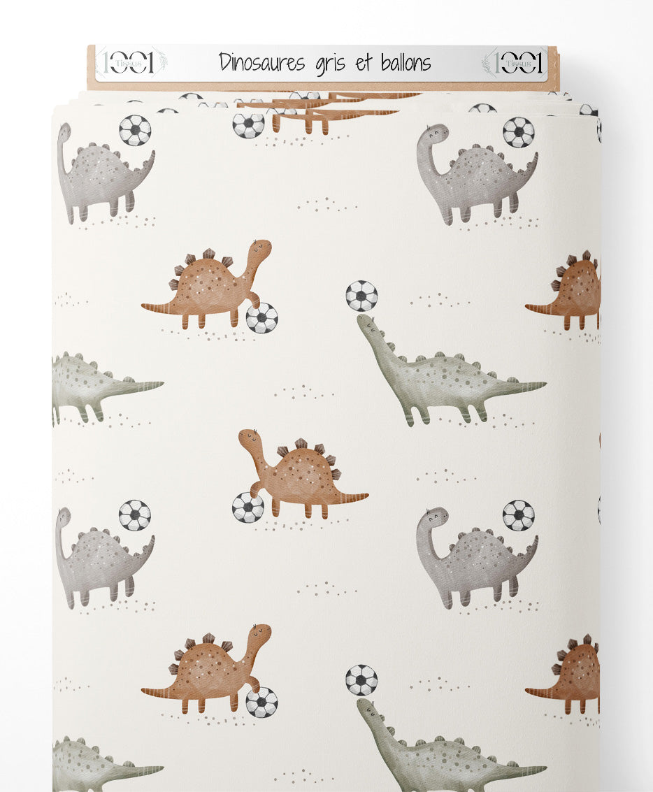 Les dinosaures sont de différentes nuances de marron et de gris. Les ballons de foot sont noirs et blancs. Le fond crème est parsemé de petits points gris.Les tissus