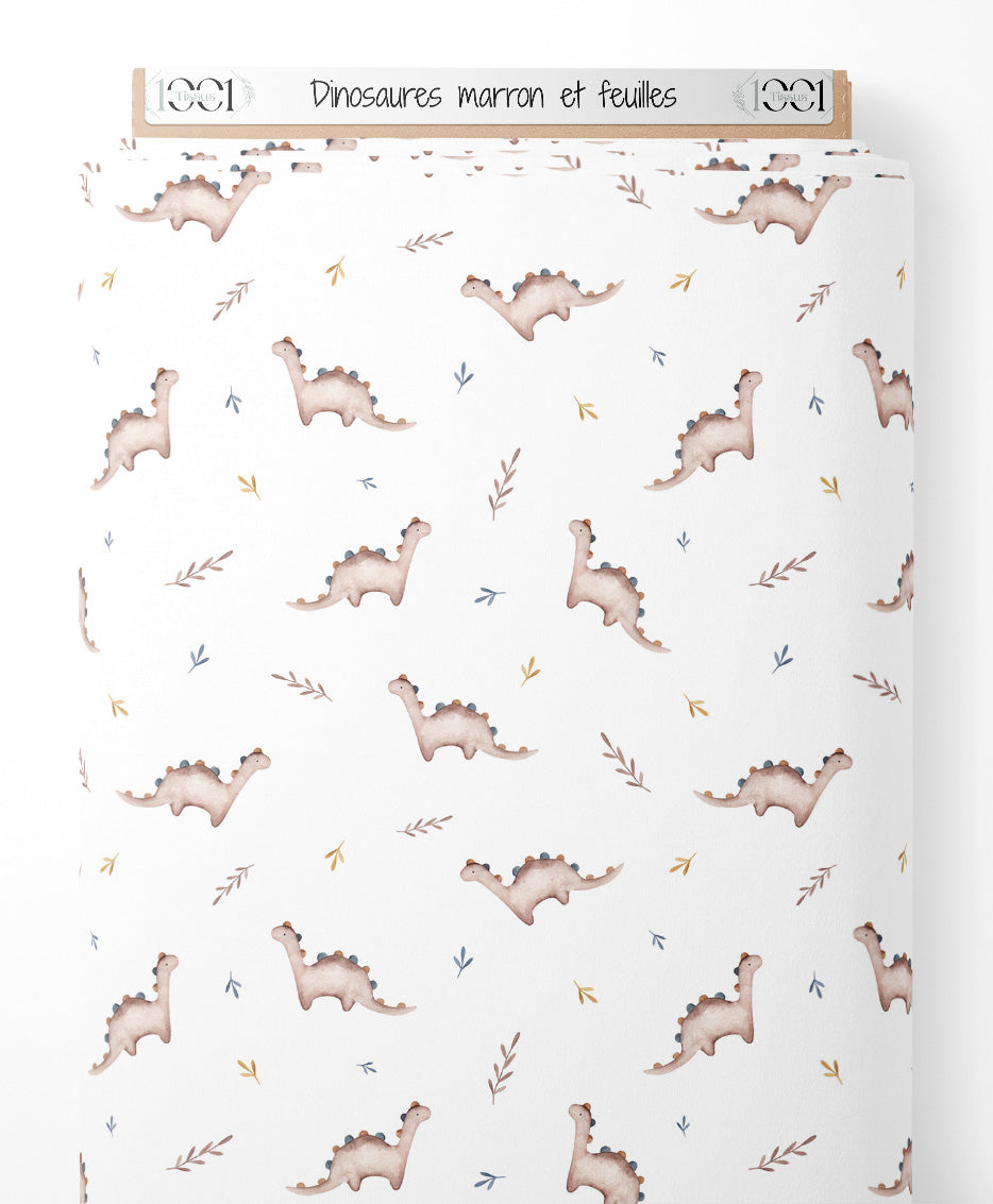 Les dinosaures sont dessinés dans des tons doux et aquarelle. Les feuilles ajoutent une touche naturelle et délicate au motif.Les tissus