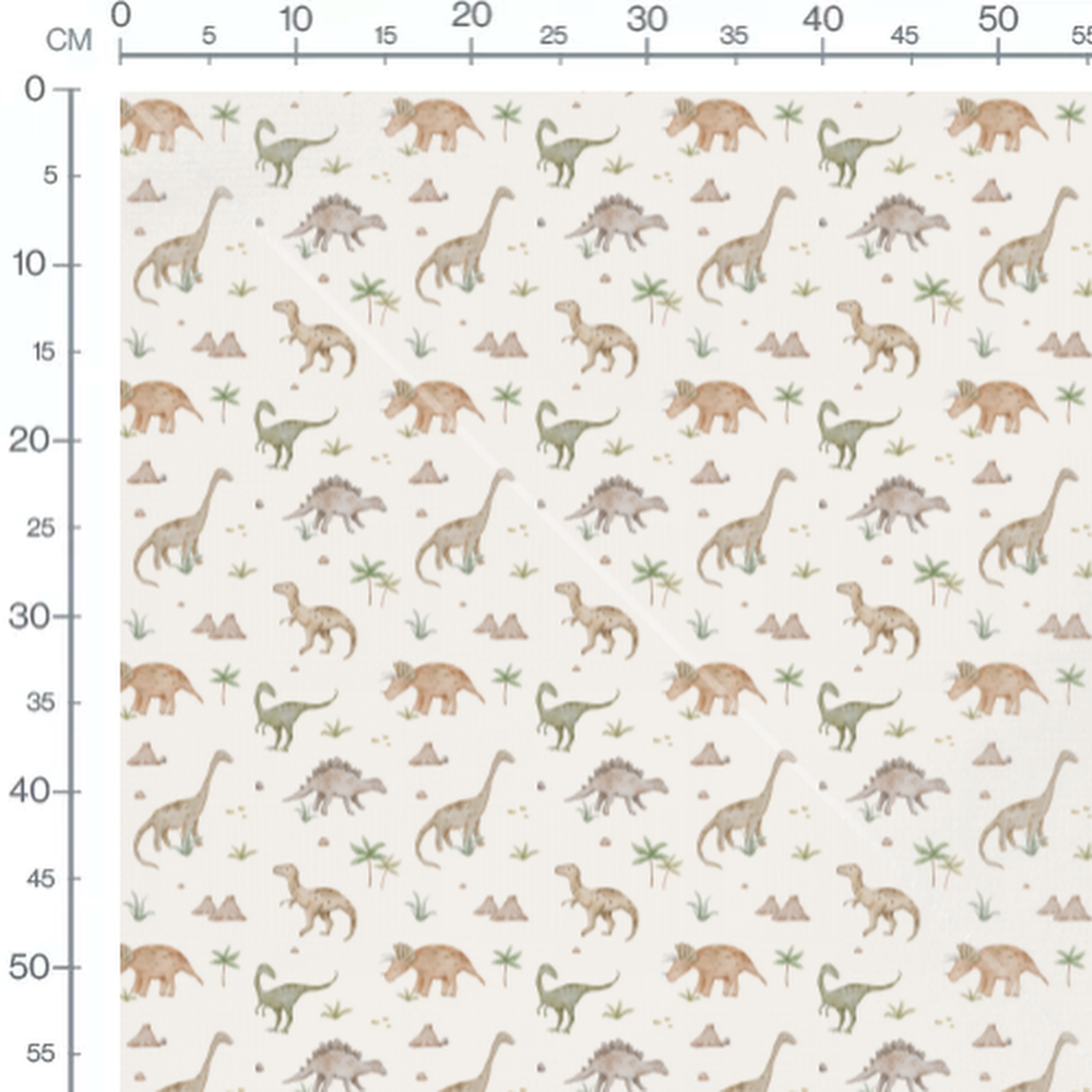 Différents types de dinosaures en nuances de marron et vert. Petites montagnes et herbes éparses. Quelques rochers et plantes ajoutent des détails au motif.Les tissus