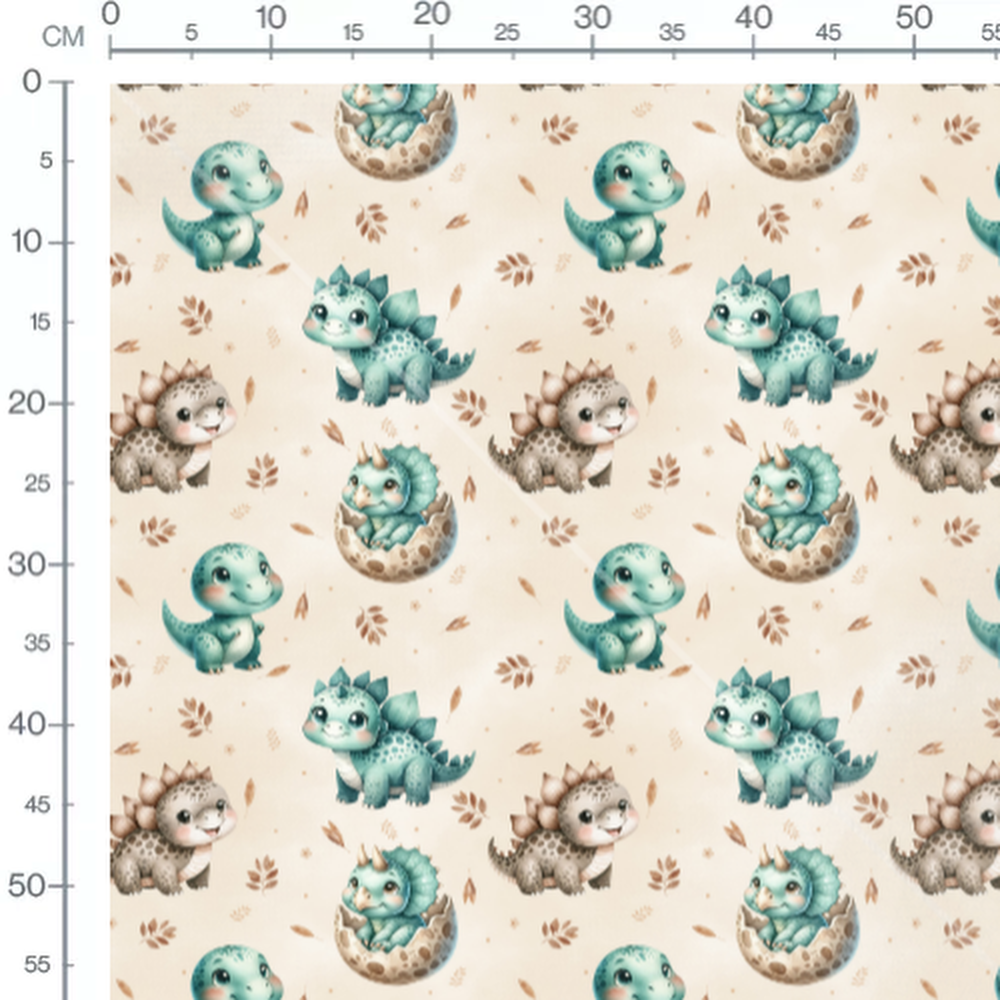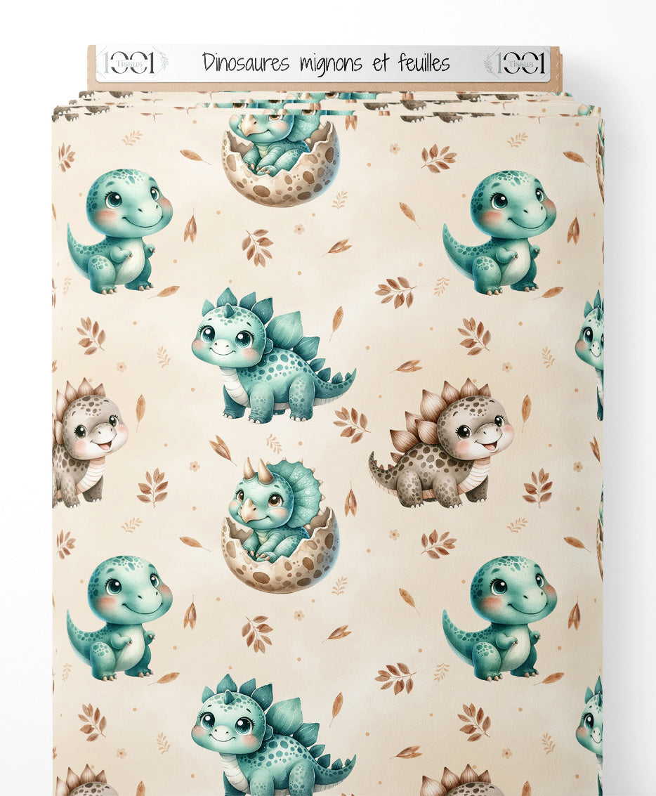 Les dinosaures présentent des expressions joyeuses et des couleurs douces. Certains dinosaures sont dans des coquilles d'œufs tachetées. Les feuilles ajoutent une touche naturelle au motif.Les tissus