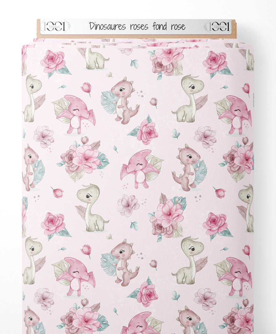 Les dinosaures sont souriants et entourés de fleurs délicates. Les feuilles vertes ajoutent une touche de fraîcheur au motif. Les couleurs pastel créent une ambiance douce et apaisante.Les tissus