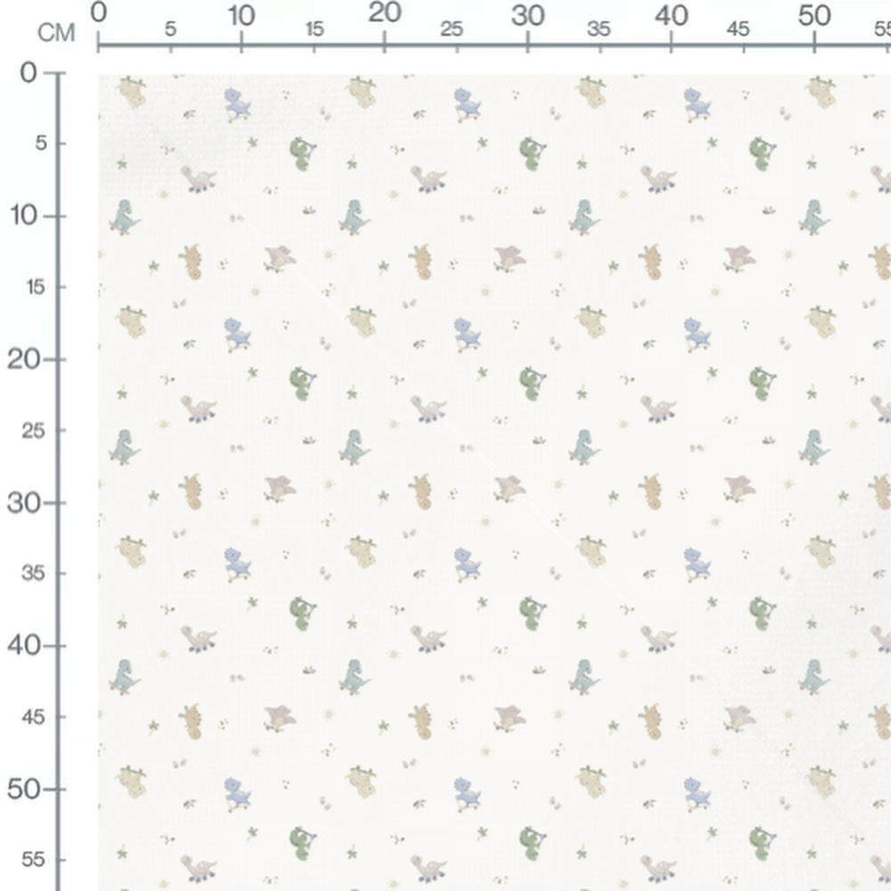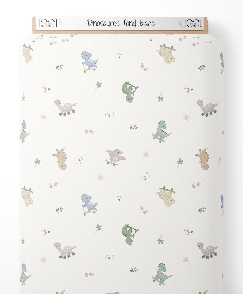Les dinosaures sont de différentes couleurs pastel comme le bleu, le vert et le beige. Ils sont accompagnés de petits motifs de fleurs et de soleils jaunes. Chaque dinosaure a une posture unique, certains sur des planches à roulettes. Le fond blanc met en valeur les couleurs douces des motifs.Les tissus