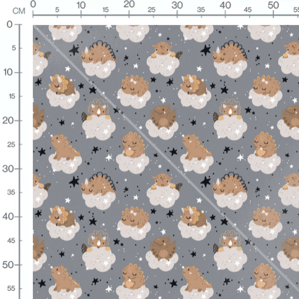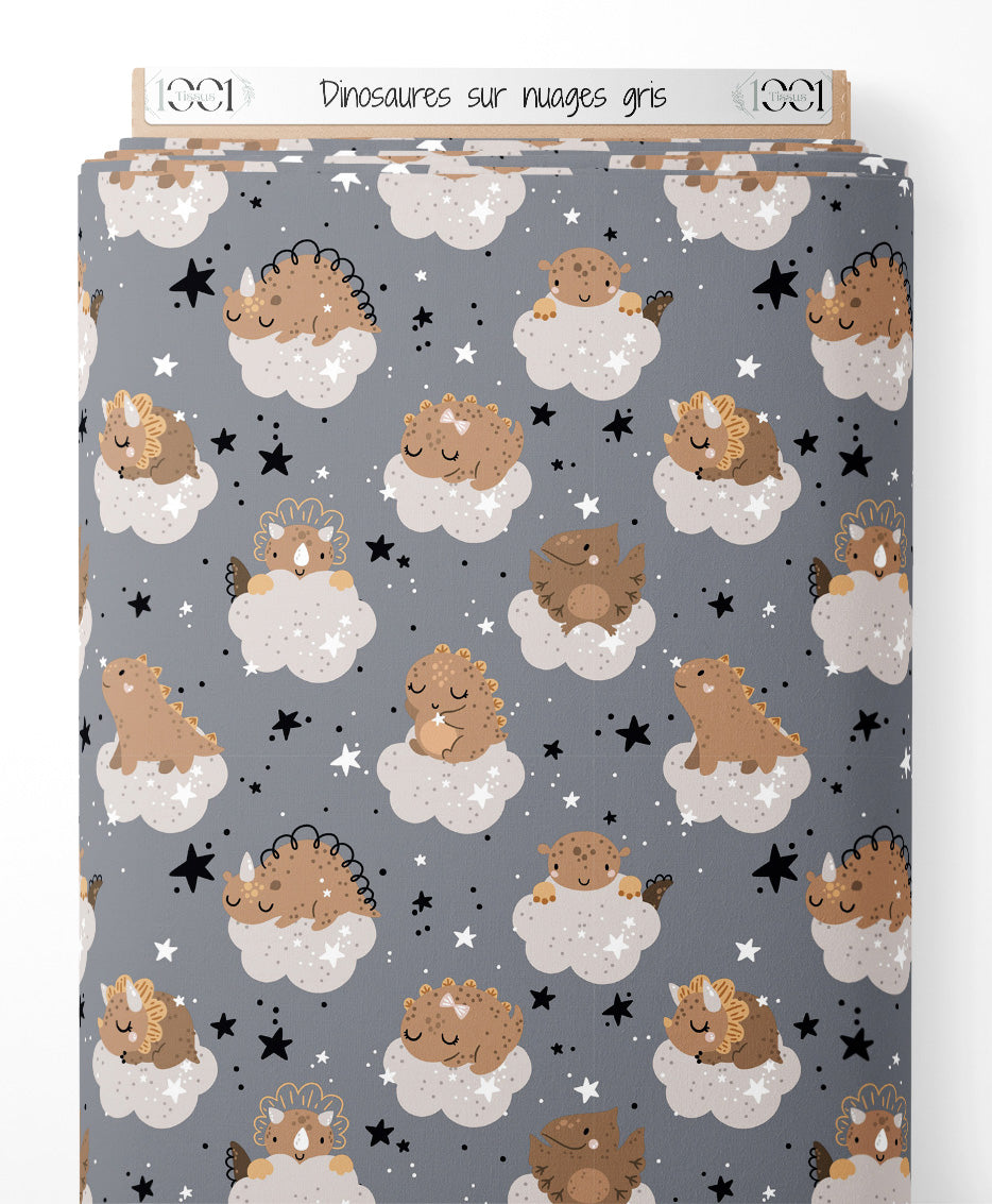 Les dinosaures ont des expressions paisibles et sont entourés de petites étoiles. Le fond gris met en valeur les motifs de nuages et d'étoiles.Les tissus