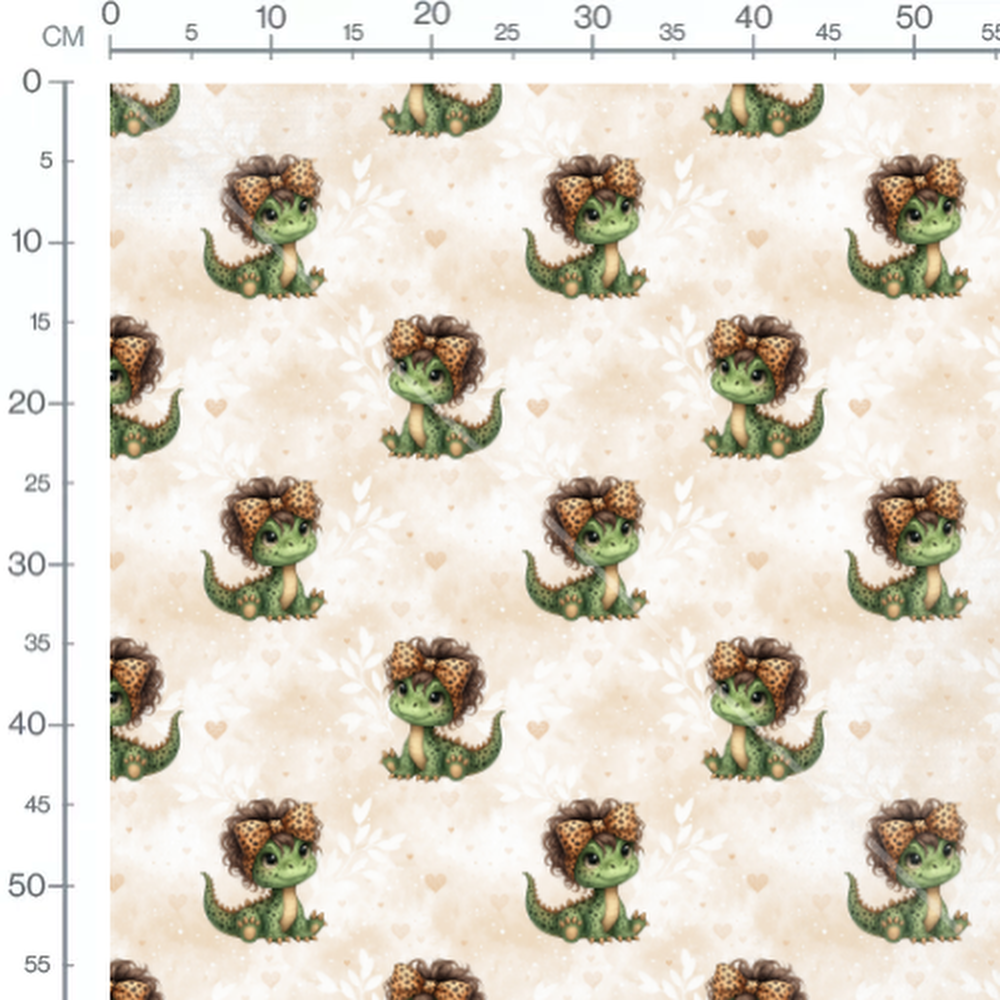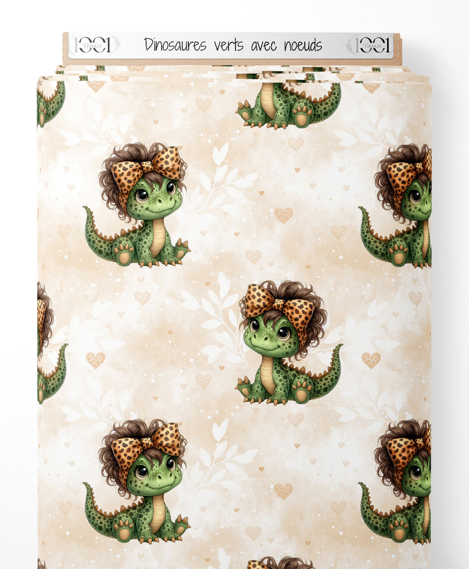 Les dinosaures ont des yeux expressifs et des nœuds à motifs léopard. Le fond beige est parsemé de petits cœurs et de motifs de feuillages blancs.Les tissus