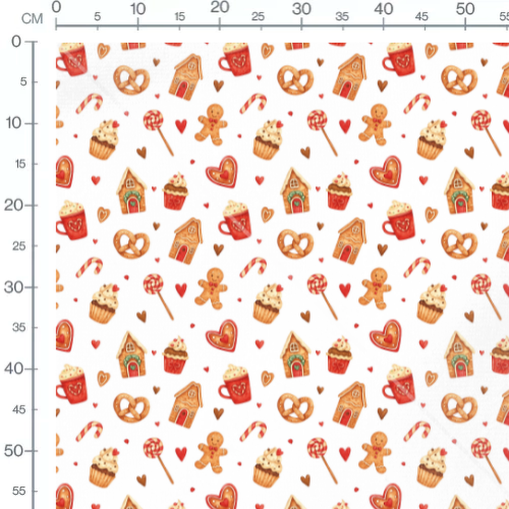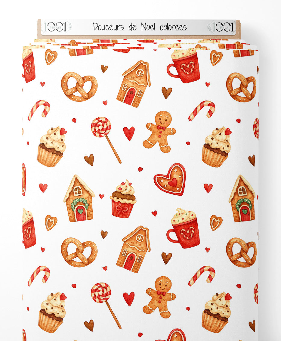 Des tasses rouges et des cupcakes décorés ajoutent une touche festive. Des bretzels et sucettes colorées apportent de la variété. Les motifs incluent également des petits cœurs et des maisons en pain d'épice.Les tissus