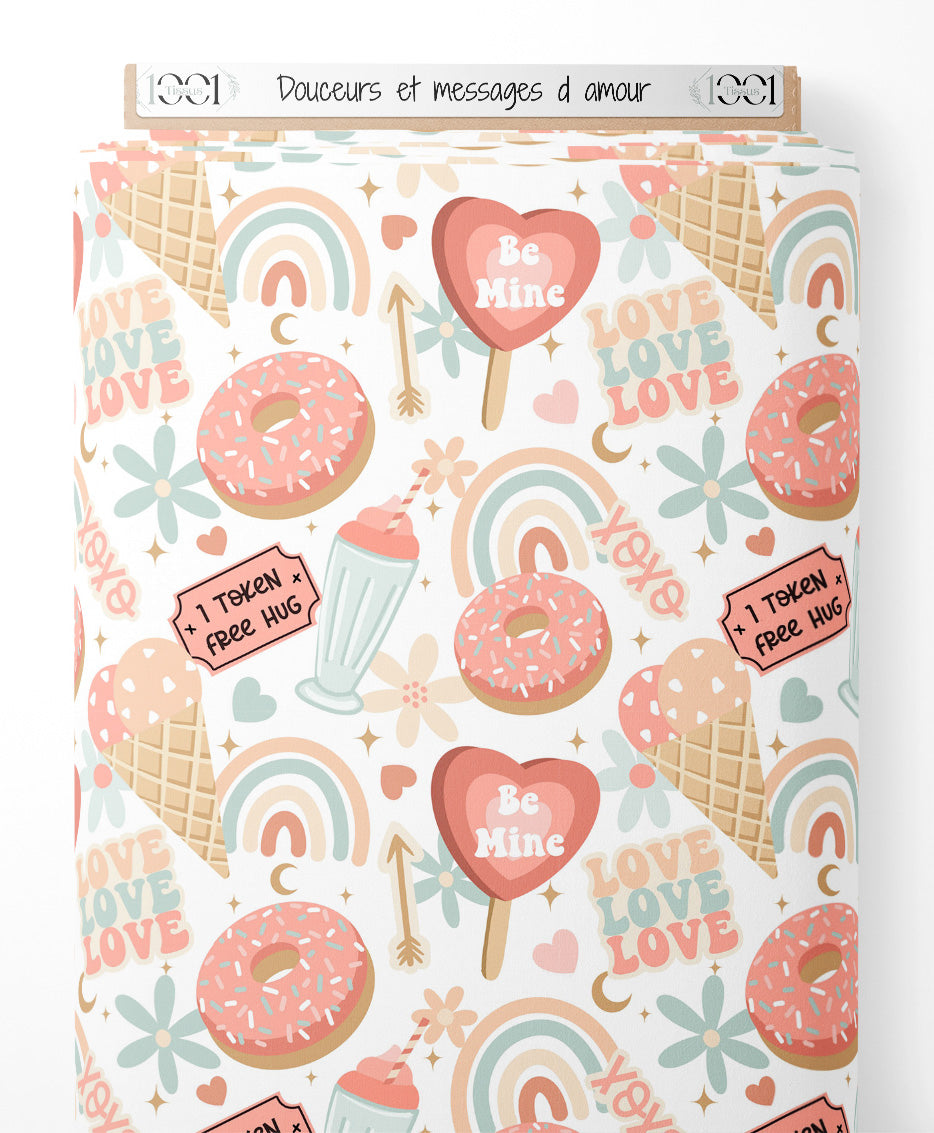 Arc-en-ciel pastel et fleurs stylisées. Cornets de glace et flèches dorées. Pancartes en forme de cœur avec inscriptions.Les tissus