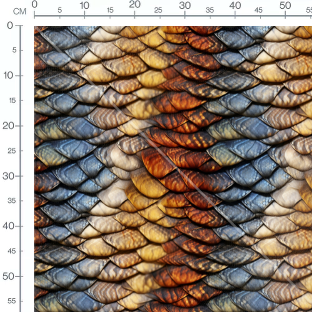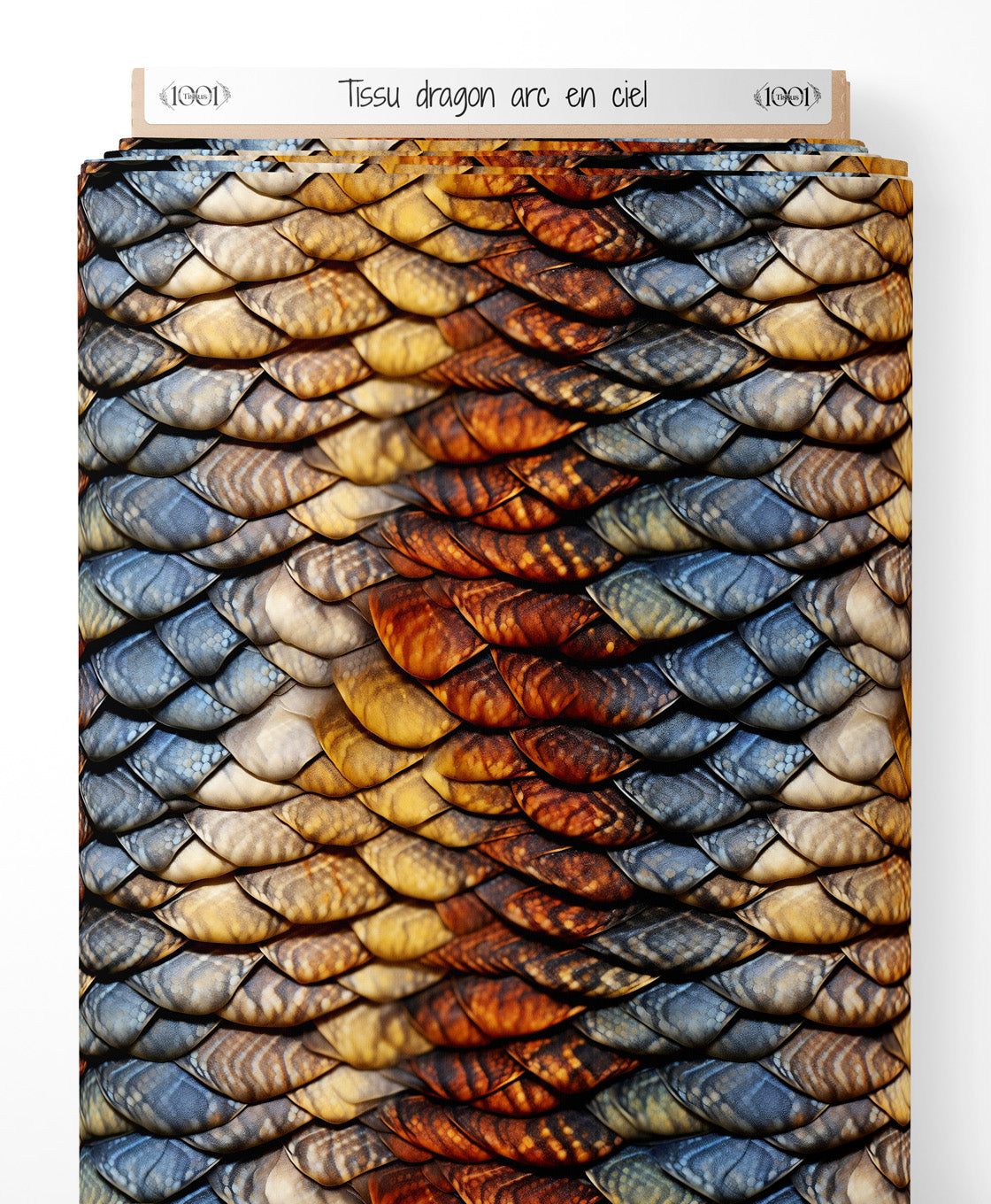Écailles multicolores avec des nuances de bleu, orange, jaune et brun sur fond imitant la peau d'un dragon. Les tissus