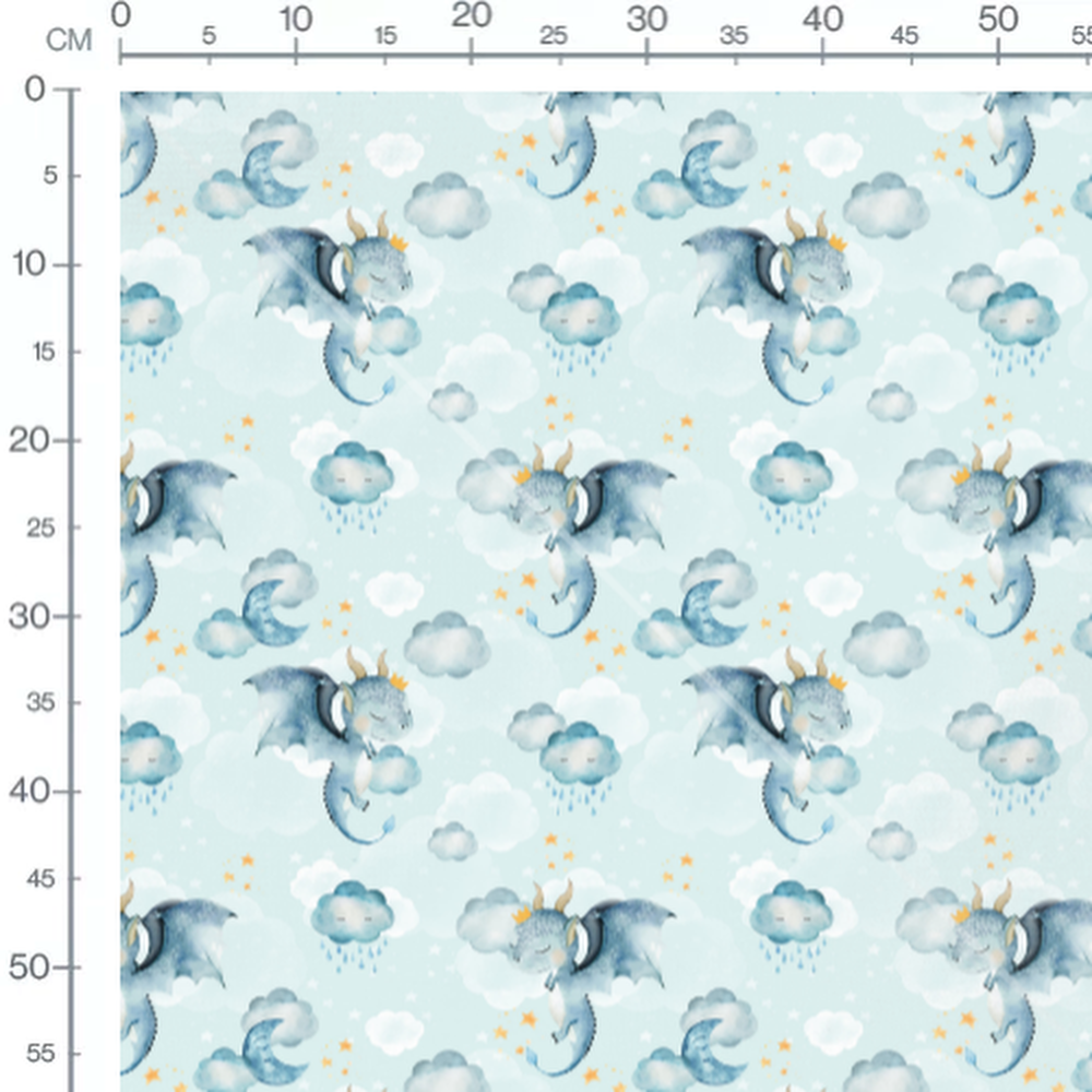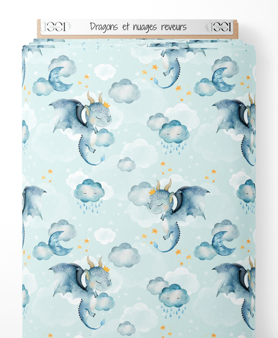 Les dragons sont accompagnés de petites étoiles orange. Les nuages ont des expressions endormies et certains pleuvent doucement. La lune souriante ajoute une touche de rêve au motif.Les tissus