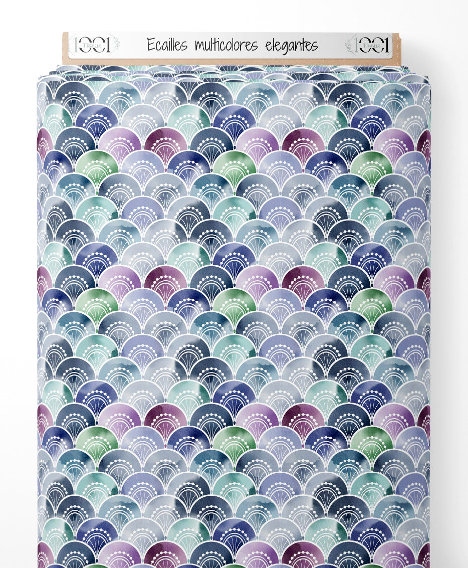 Les écailles présentent des motifs en éventail blancs. Les couleurs varient du bleu au vert, en passant par le violet et le rose. Chaque écaille est ornée de petits points blancs.Les tissus