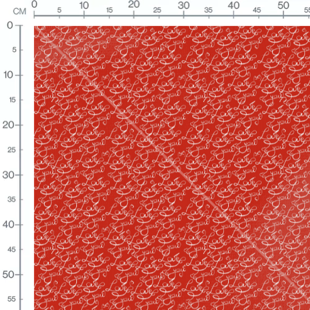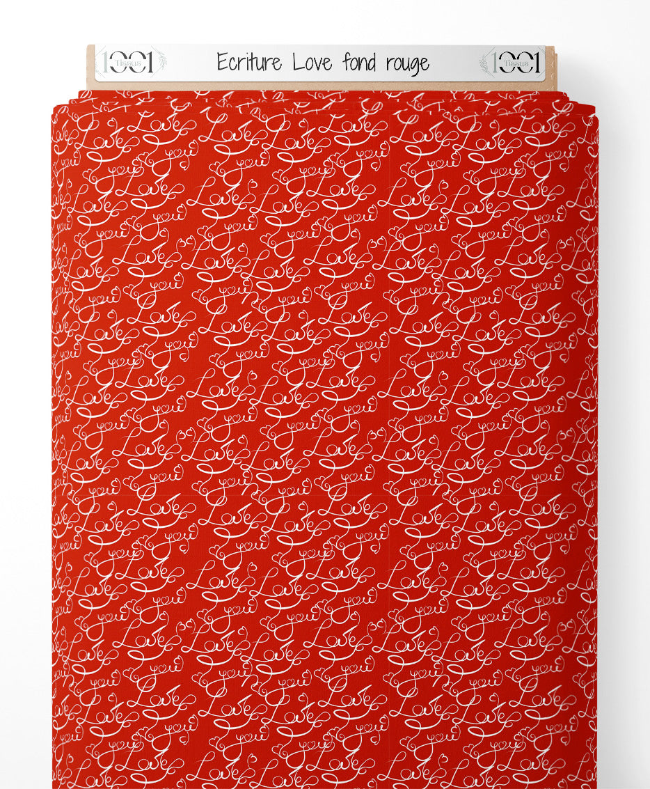 Les mots sont répétés de manière fluide et continue. Le fond rouge vif met en valeur l'écriture blanche. Les lettres sont entrelacées pour un effet harmonieux.Les tissus