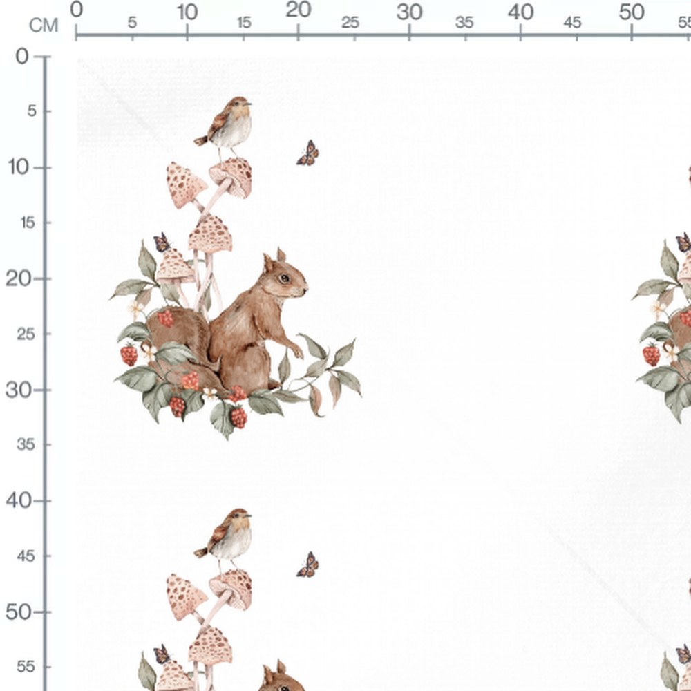 Un écureuil brun est entouré de champignons tachetés et de baies rouges. Un oiseau est perché au-dessus, accompagné d'un papillon. Des feuilles vertes complètent le motif sur un fond blanc.Les tissus