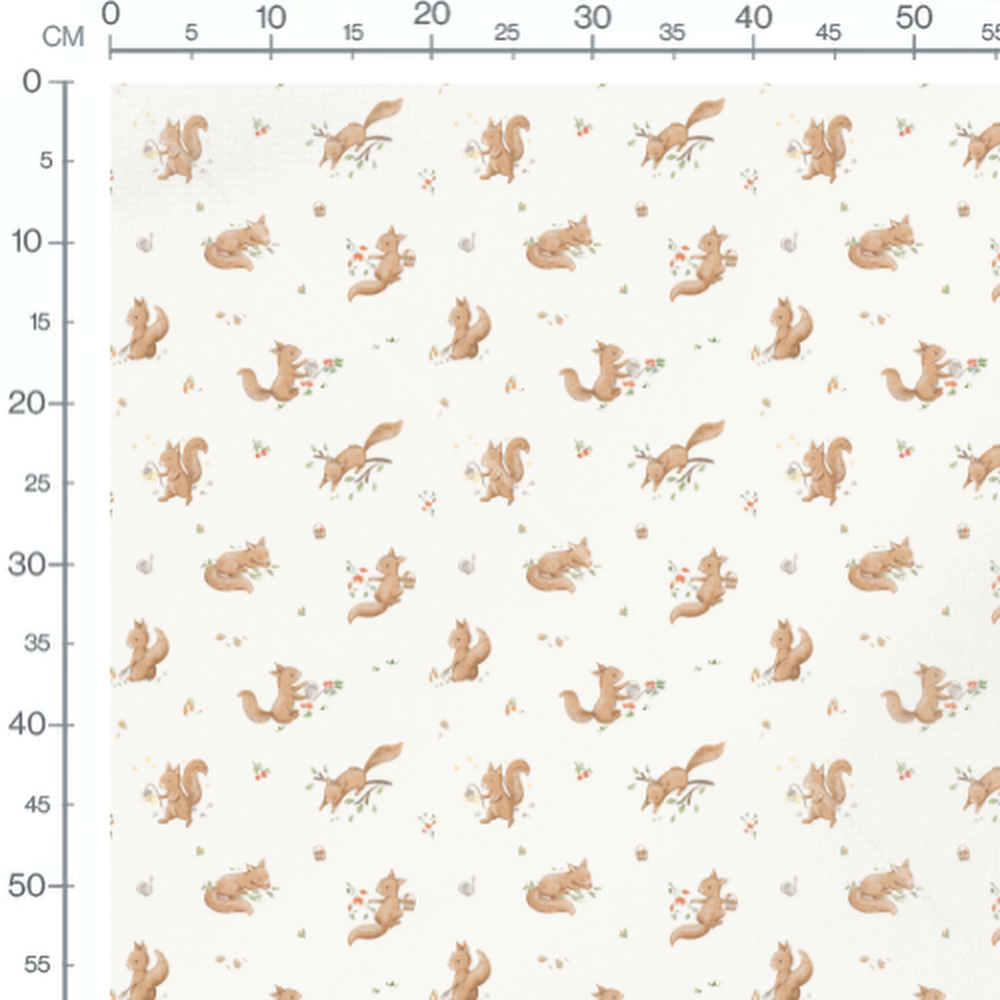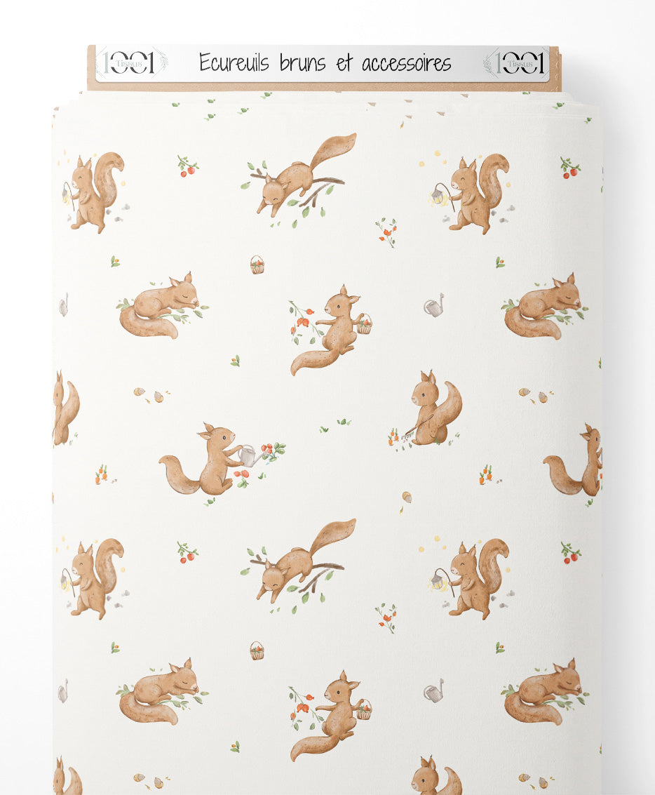 Les écureuils tiennent des arrosoirs et des lanternes. Quelques champignons et fleurs oranges complètent le motif.Les tissus