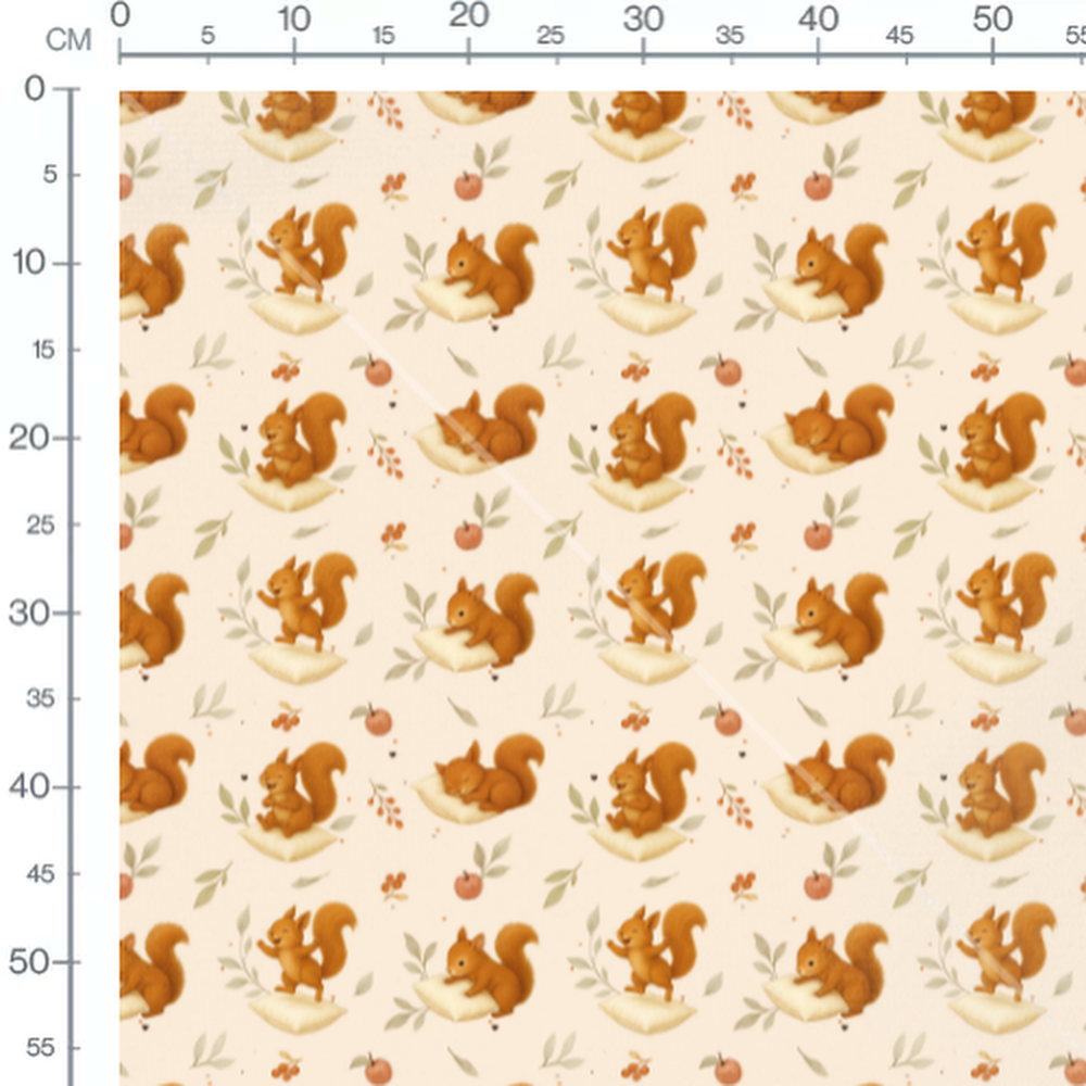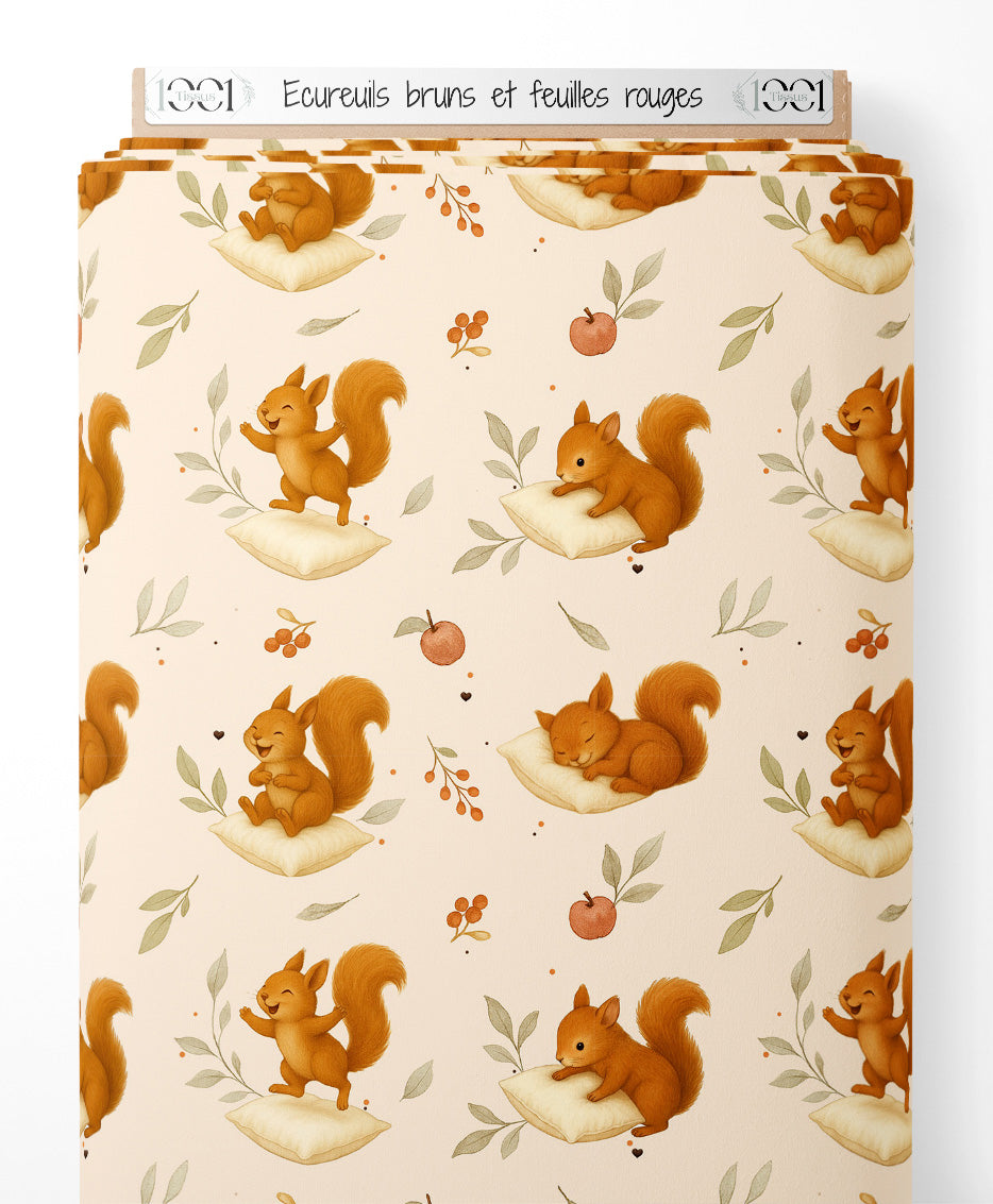 Les écureuils sont dessinés dans différentes poses sur des coussins blancs. Des feuilles vertes et des petites baies rouges ajoutent des détails au fond beige.Les tissus