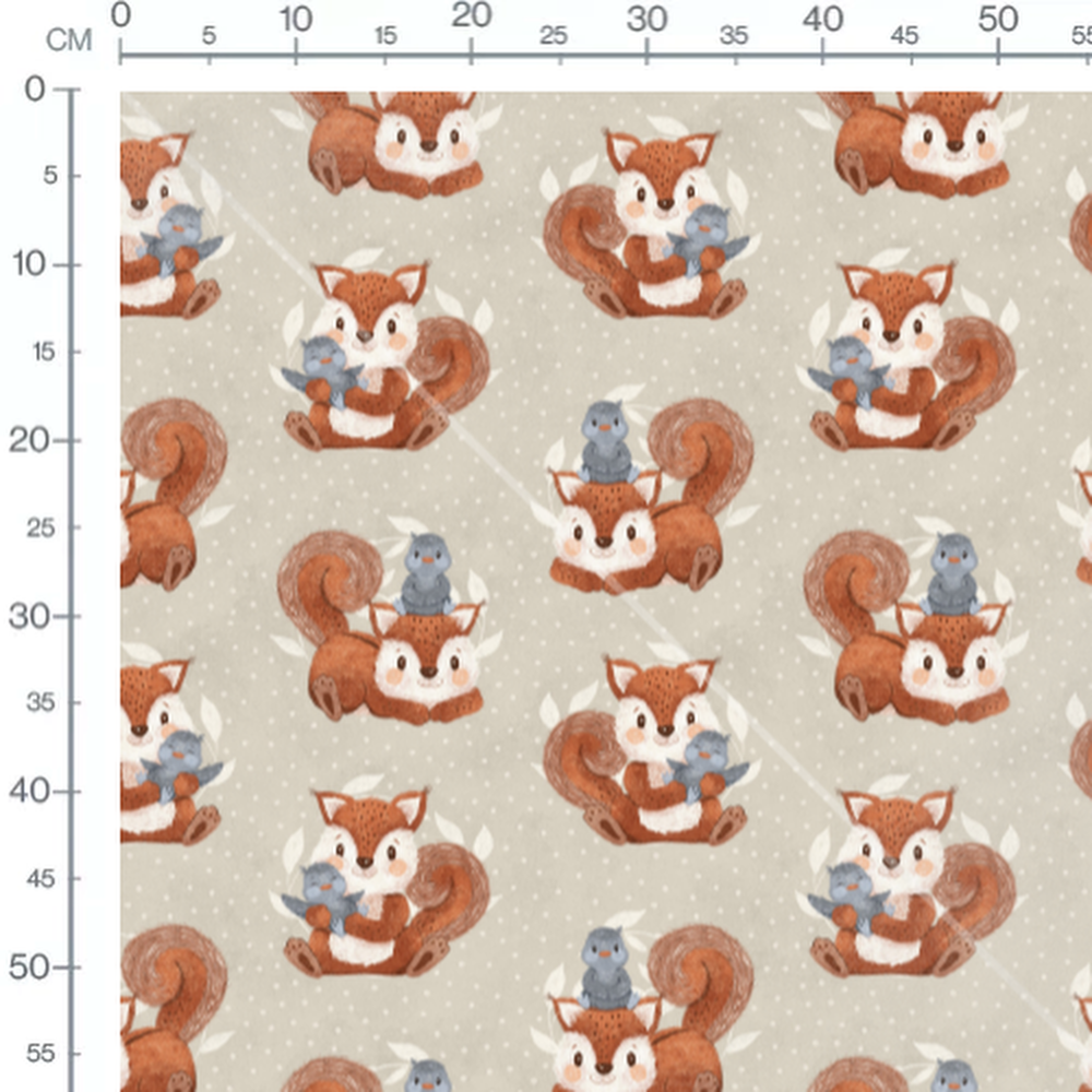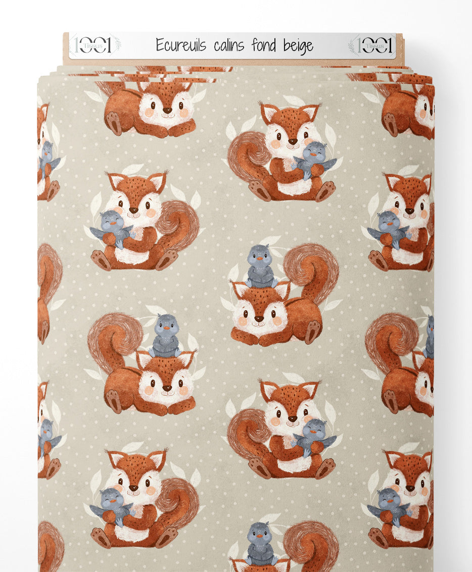 Les écureuils ont une fourrure détaillée et des expressions amicales. Les oiseaux bleus sont petits et ronds, ajoutant une touche de douceur. Le fond beige est parsemé de petits pois blancs, créant un effet de texture. Les feuilles blanches apportent une touche naturelle et délicate.Les tissus