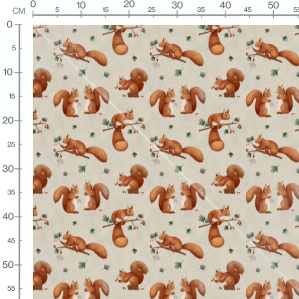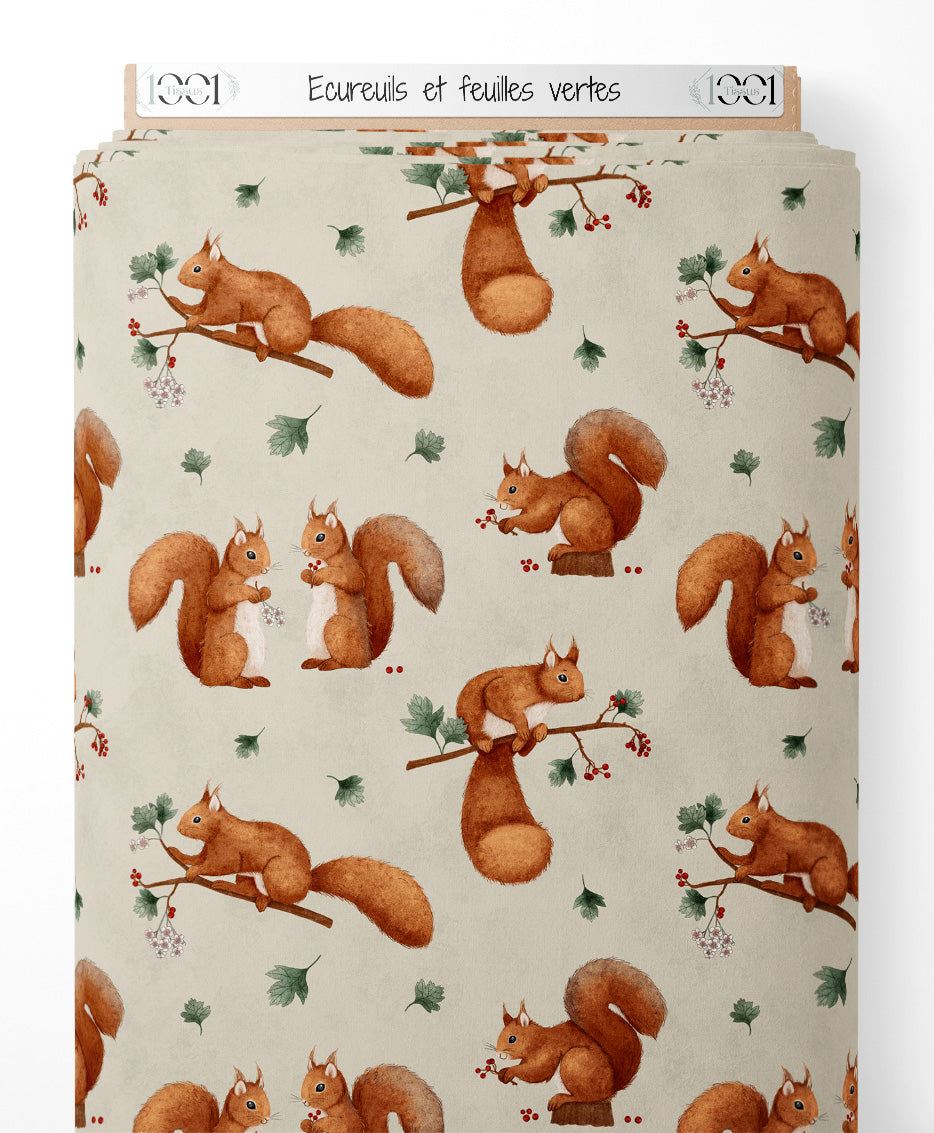 Les écureuils sont représentés dans différentes positions. Les feuilles vertes ajoutent une touche naturelle au motif. Les baies rouges apportent une légère couleur contrastante.Les tissus