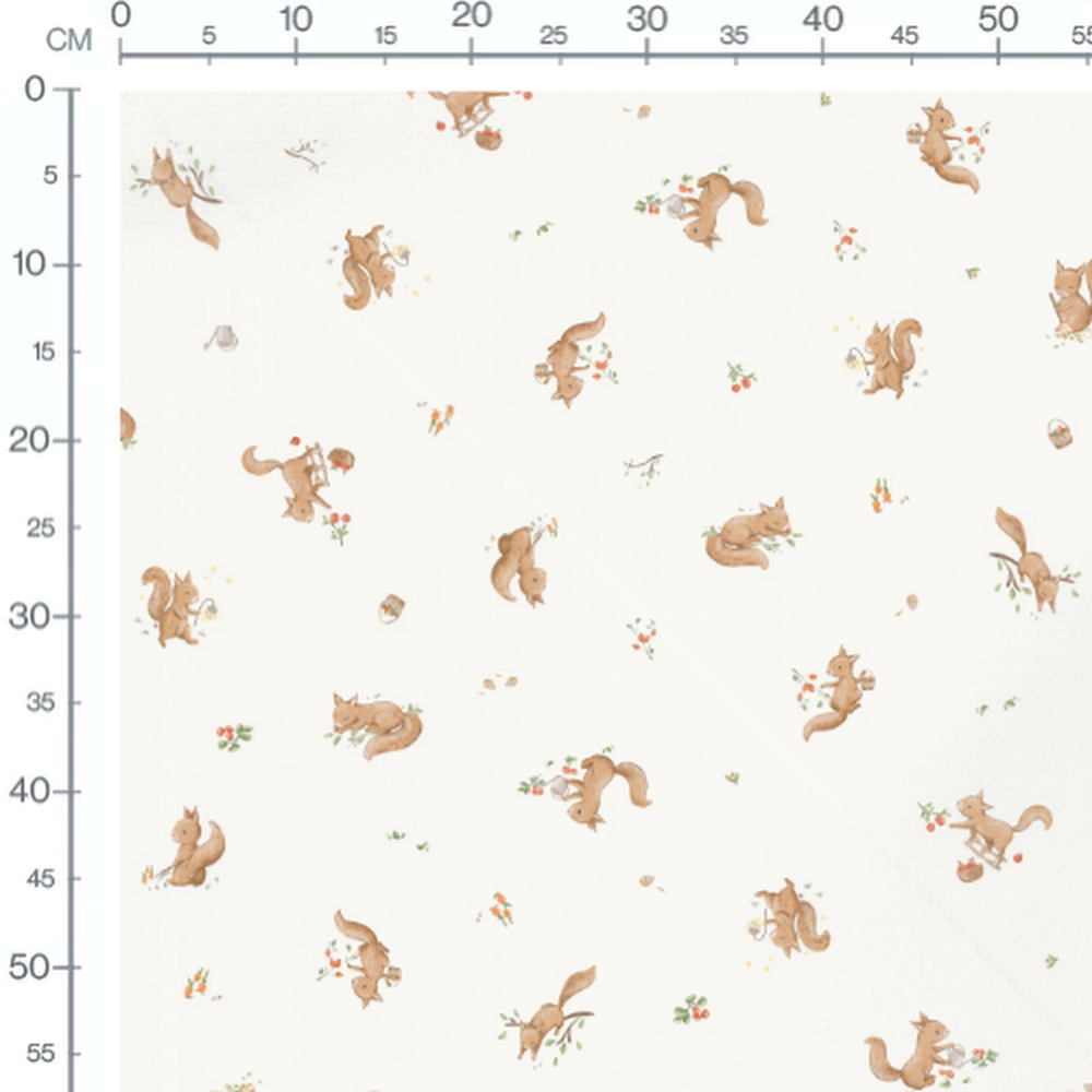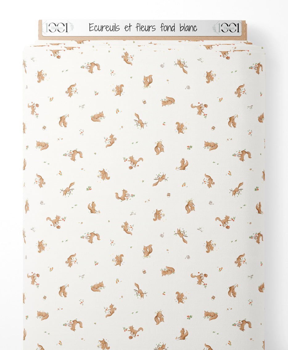 Les écureuils sont accompagnés de petites fleurs colorées. Quelques glands et feuilles ajoutent des détails au motif.Les tissus