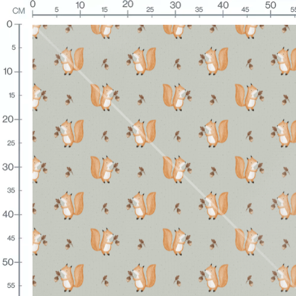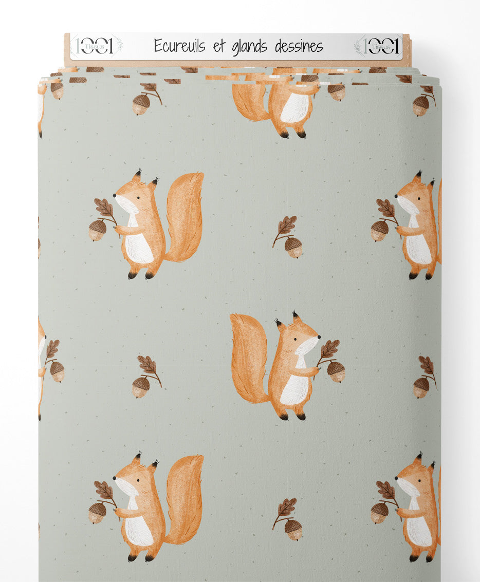 Les écureuils sont dessinés avec des détails fins et tiennent des glands bruns. Le fond vert pâle est parsemé de petits points gris, ajoutant une texture subtile.Les tissus