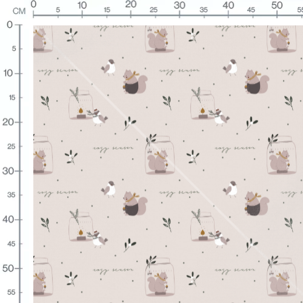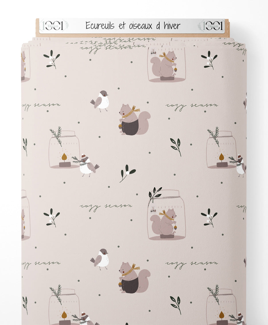 Les écureuils portent des écharpes et les oiseaux des bonnets. Des pots en verre contiennent des petites bougies et des branches. Le fond beige est parsemé de petits points et de feuillages verts.Les tissus