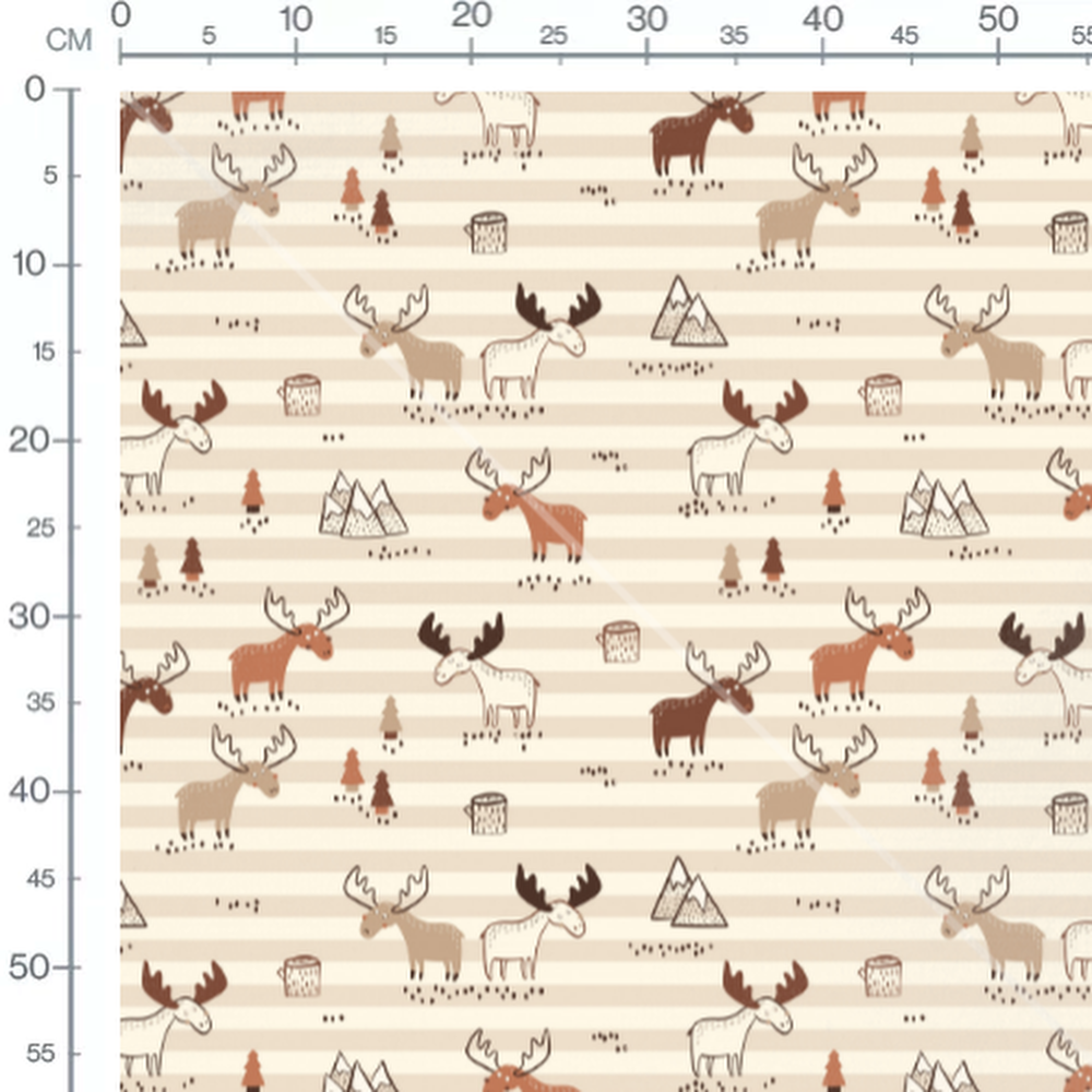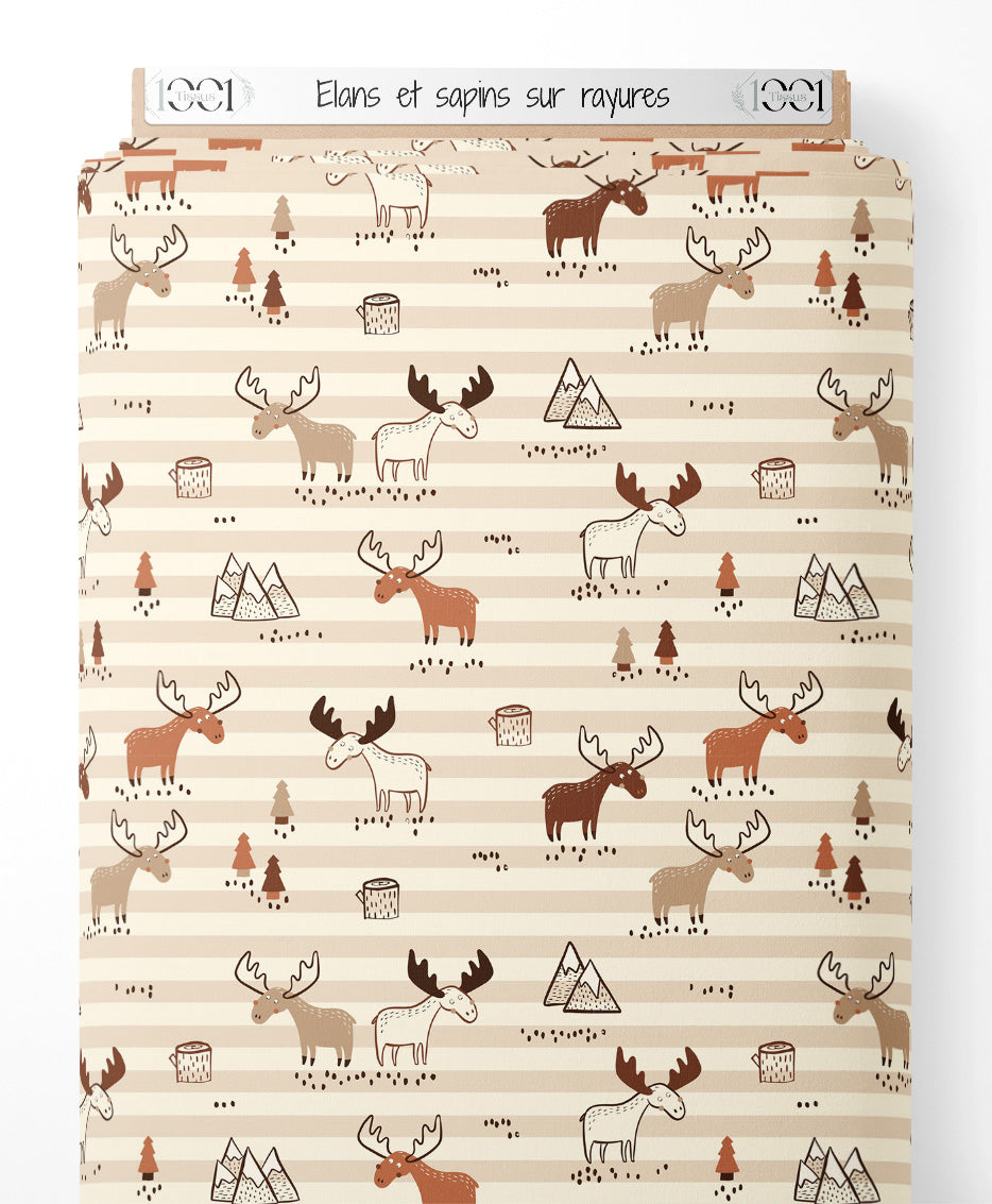 Les élans sont dessinés dans des tons marron et crème. Les sapins et montagnes sont stylisés et accompagnés de troncs d'arbres. Le fond est composé de rayures horizontales beiges.Les tissus