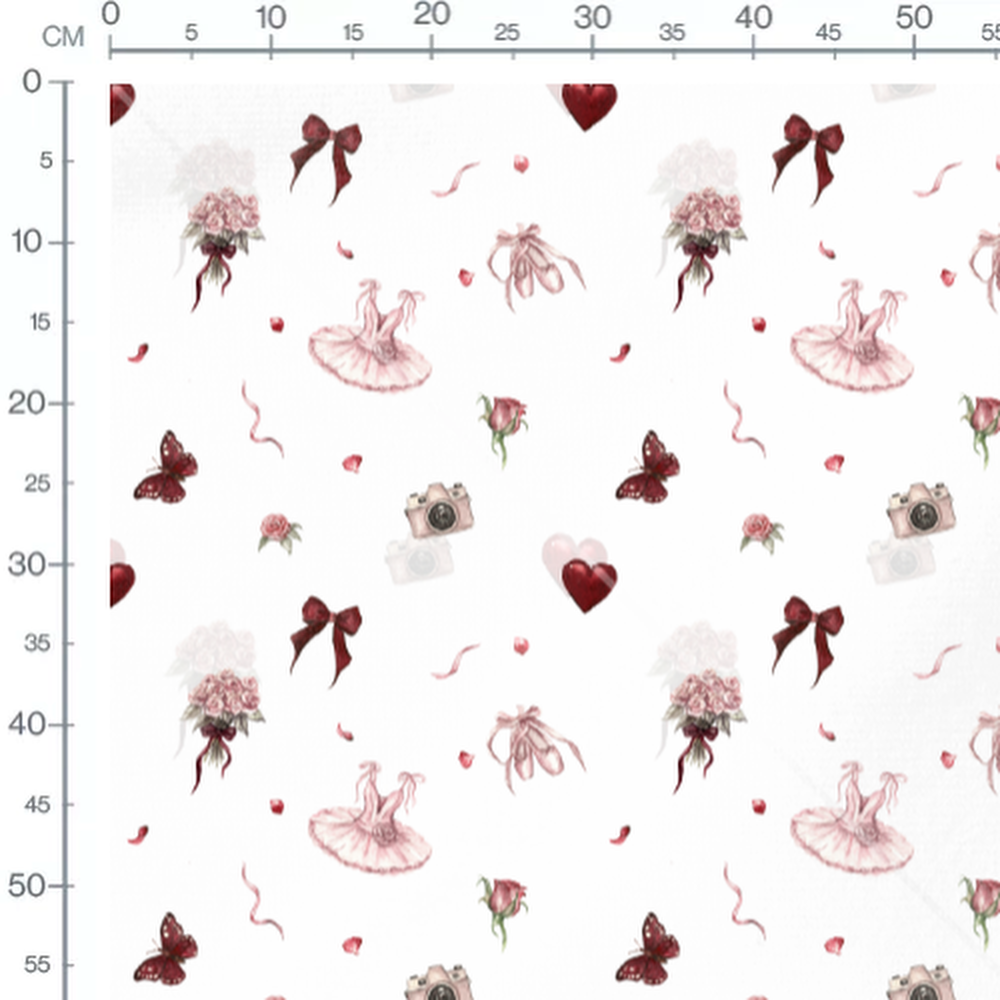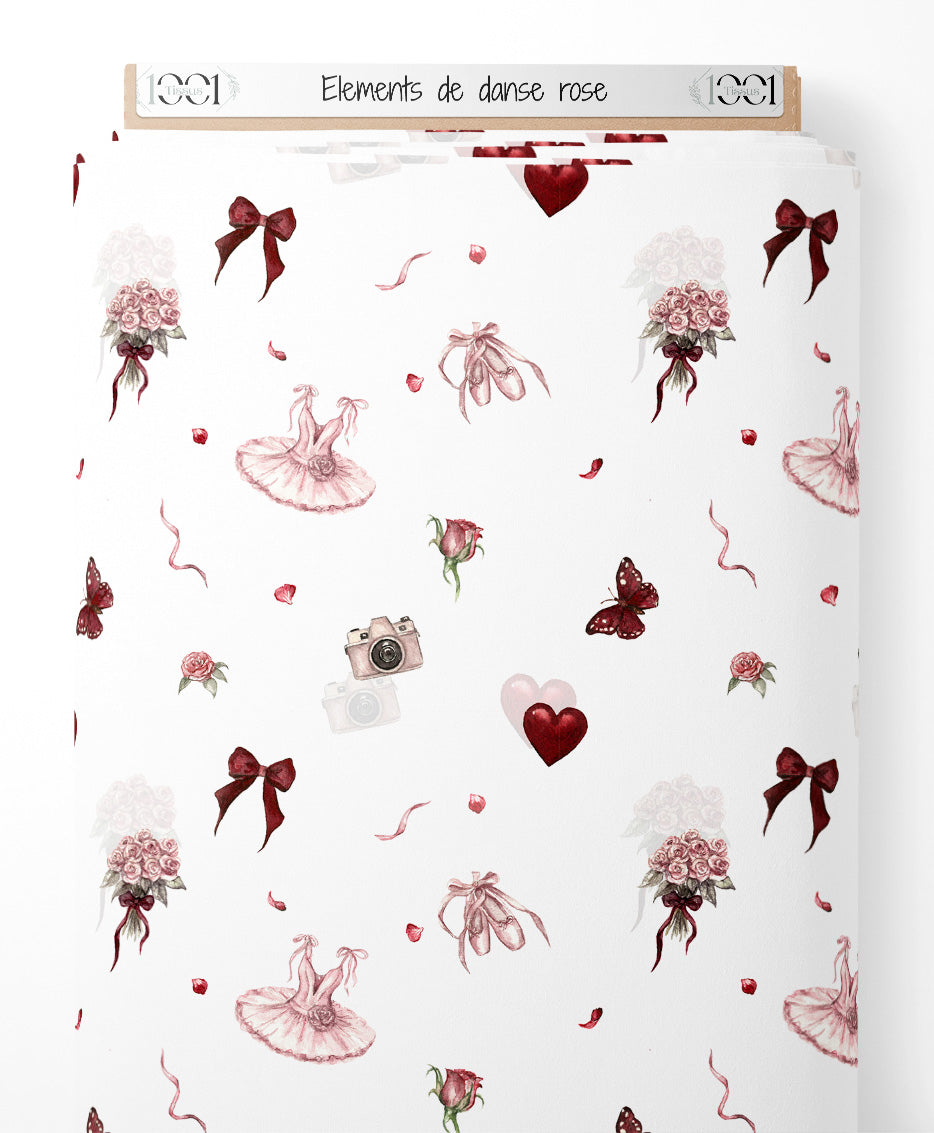 Des rubans et des nœuds rouges ajoutent une touche élégante. Des pointes de danse et un tutu sont présents. Des cœurs et des pétales de rose apportent une ambiance romantique.Les tissus