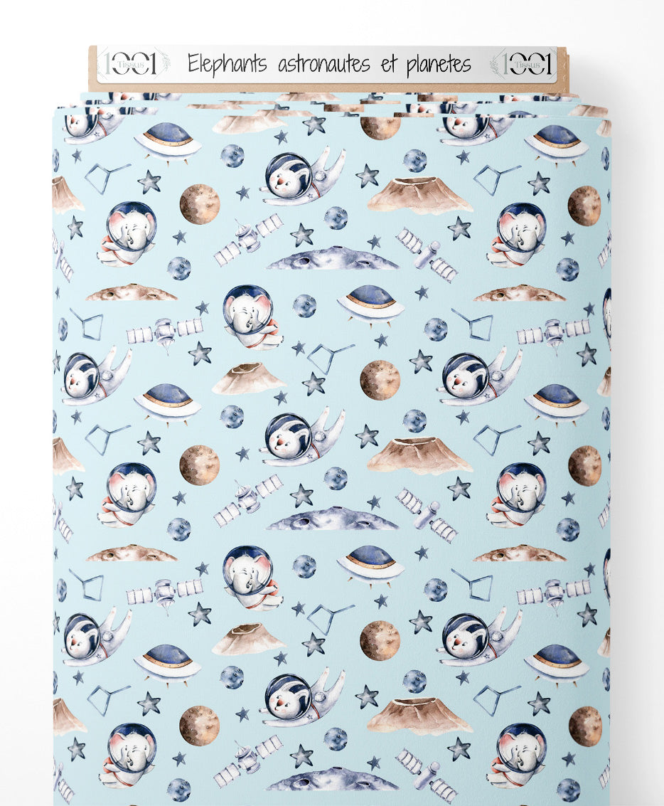 Les éléphants portent des casques d'astronautes. Des planètes et des étoiles complètent le motif spatial. Des vaisseaux spatiaux et des satellites ajoutent une touche futuriste.Les tissus