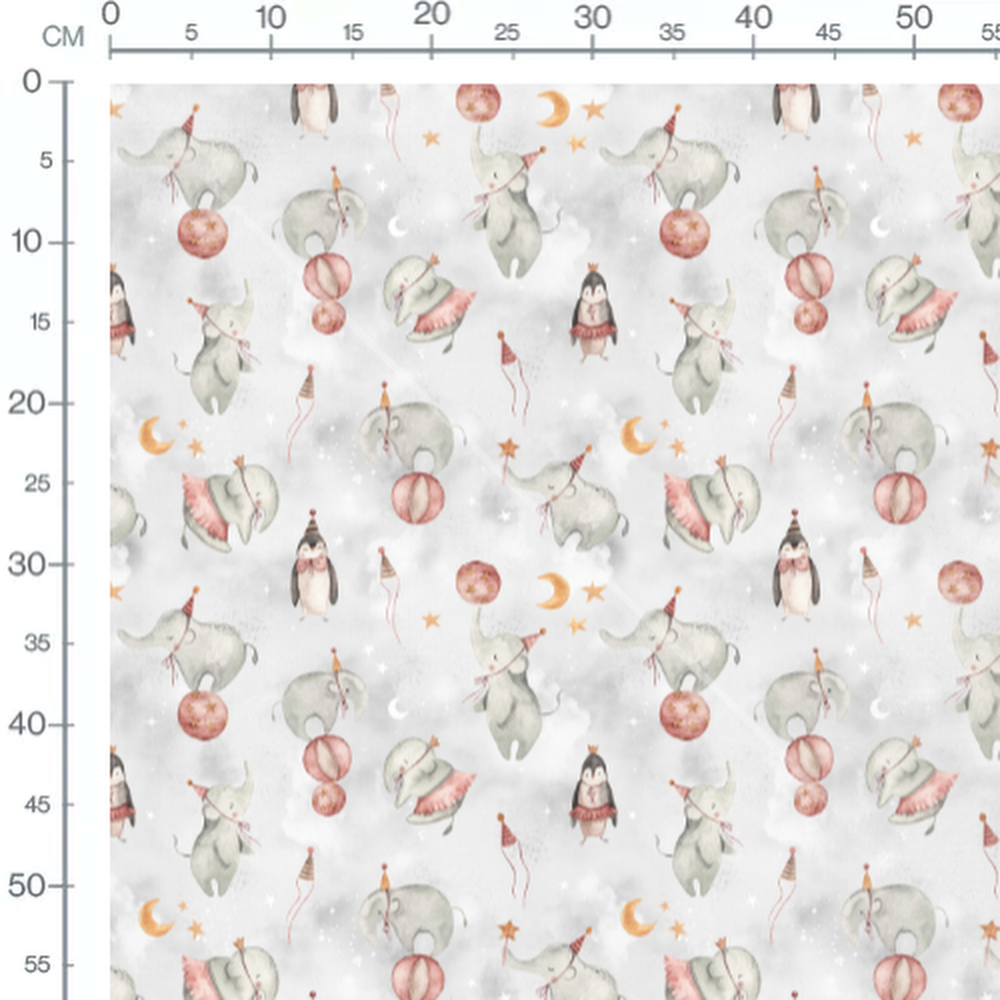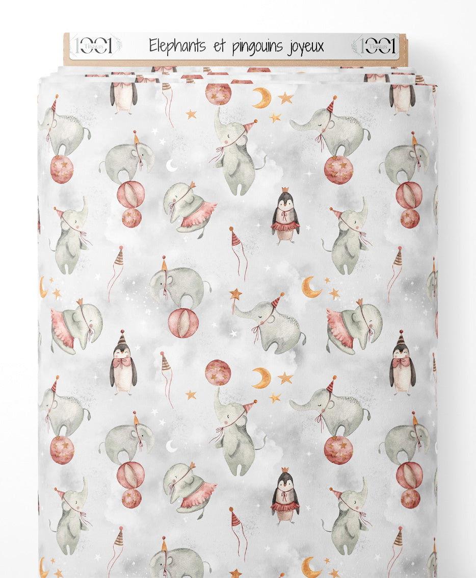 Les éléphants portent des tutus roses et jonglent avec des ballons. Les pingouins sont coiffés de chapeaux pointus rouges. Des étoiles et des lunes dorées parsèment le fond.Les tissus