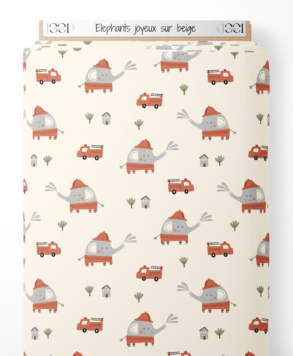 Tissu - Éléphants joyeux sur beige
