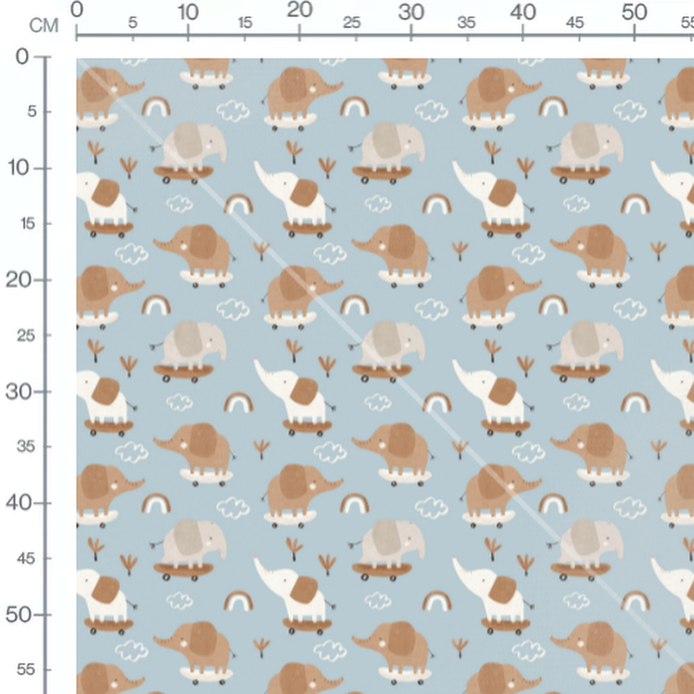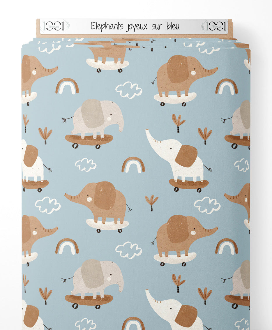 Petits arbres marron ajoutent une touche naturelle. Les éléphants sont dessinés de manière simple et amusante. Les arcs-en-ciel et nuages apportent une ambiance joyeuse.Les tissus