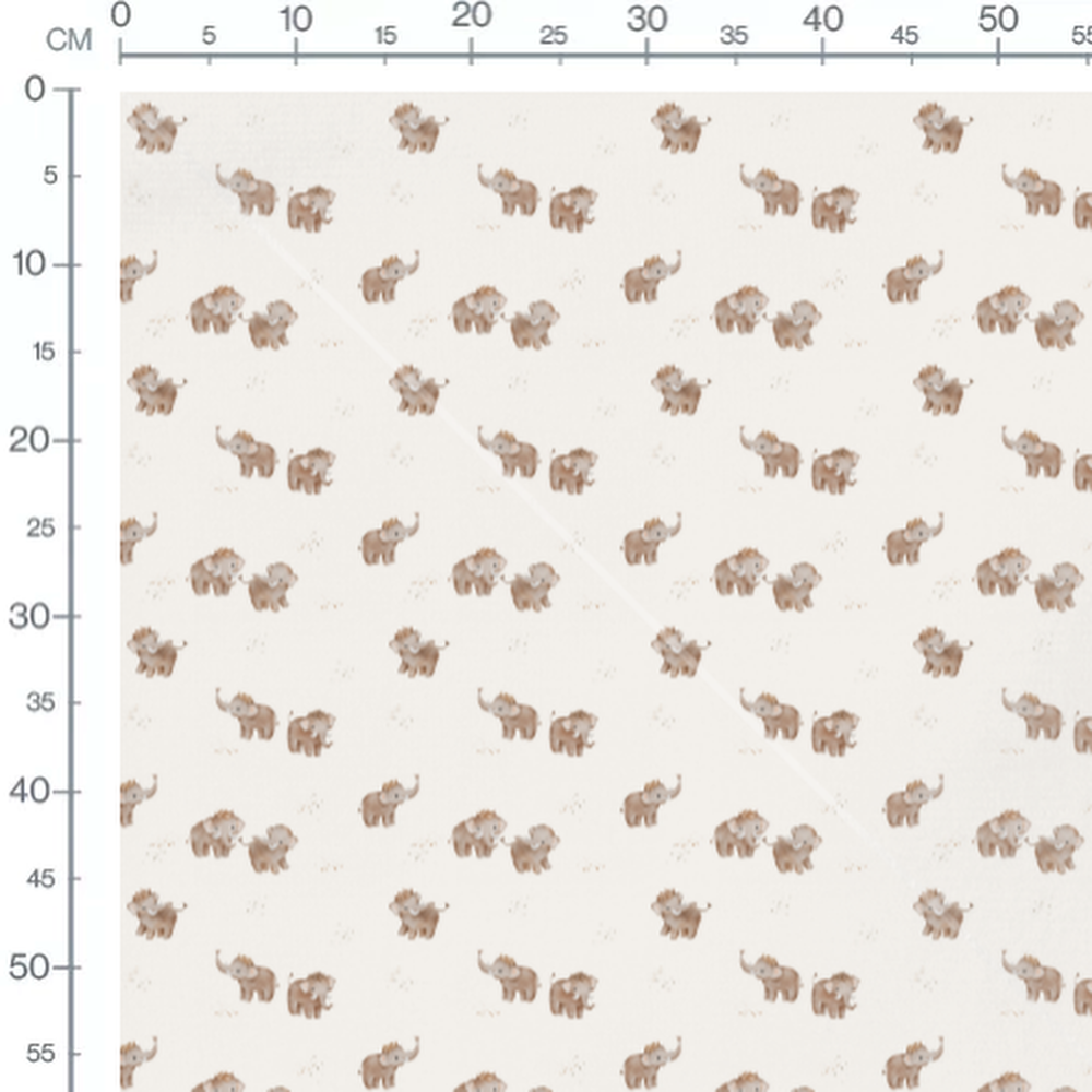 Les éléphants sont dessinés avec des expressions amicales et des détails subtils. Le fond crème est parsemé de petites taches qui ajoutent une touche de texture. Chaque éléphant semble avoir une posture différente, ce qui apporte du dynamisme au motif.Les tissus